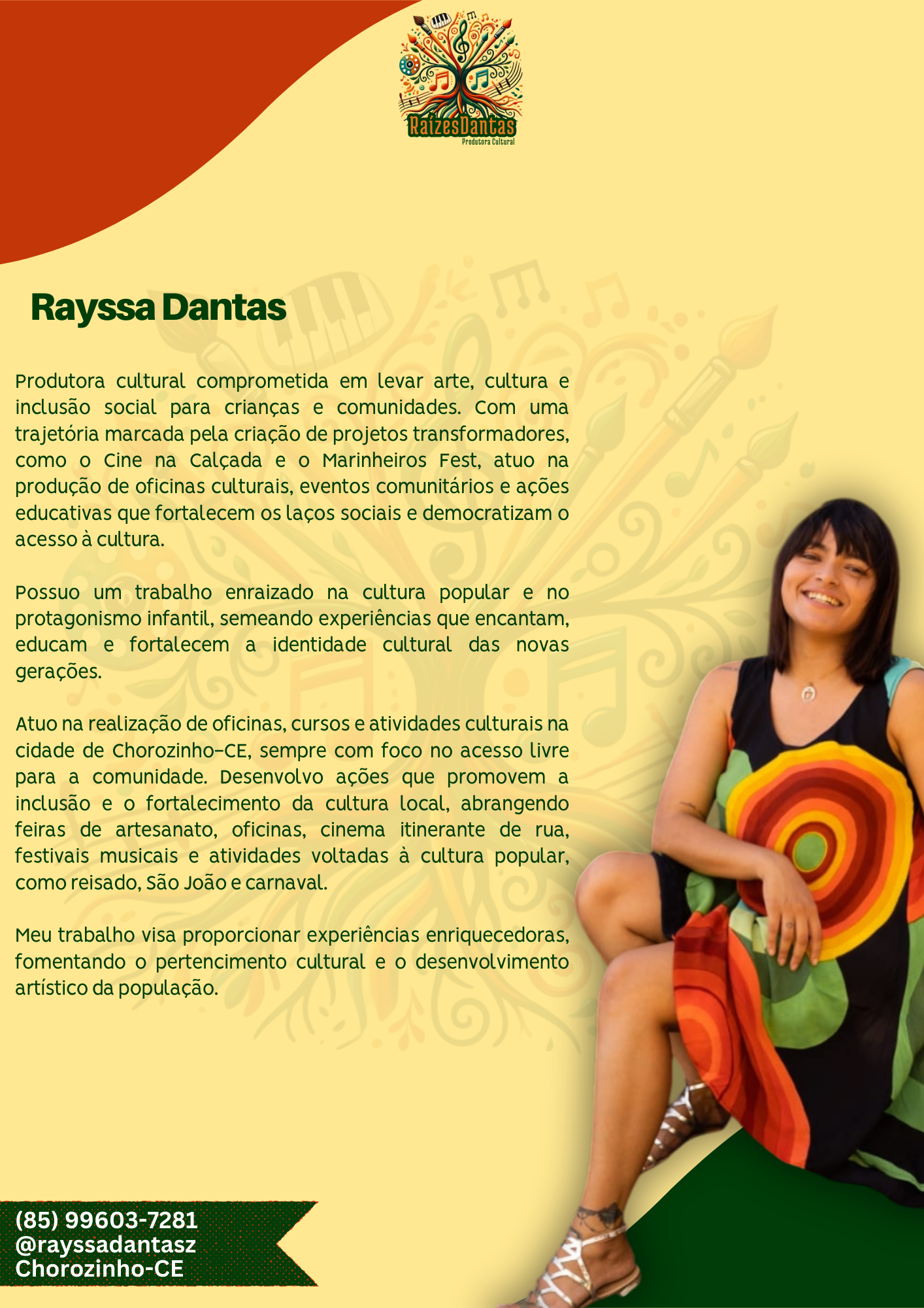 Apaixonada pela cultura, criadora de eventos incríveis que celebram a diversidade e a riqueza da cultura popular. Minha paixão é criar experiências que inspiram e conectam as pessoas.