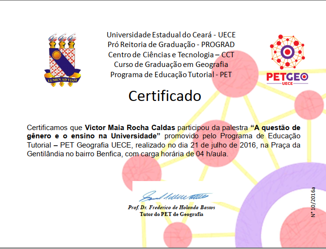 * Certificação em A Questão de Gênero e o Ensino na Universidade - FAFIDAM (2016)