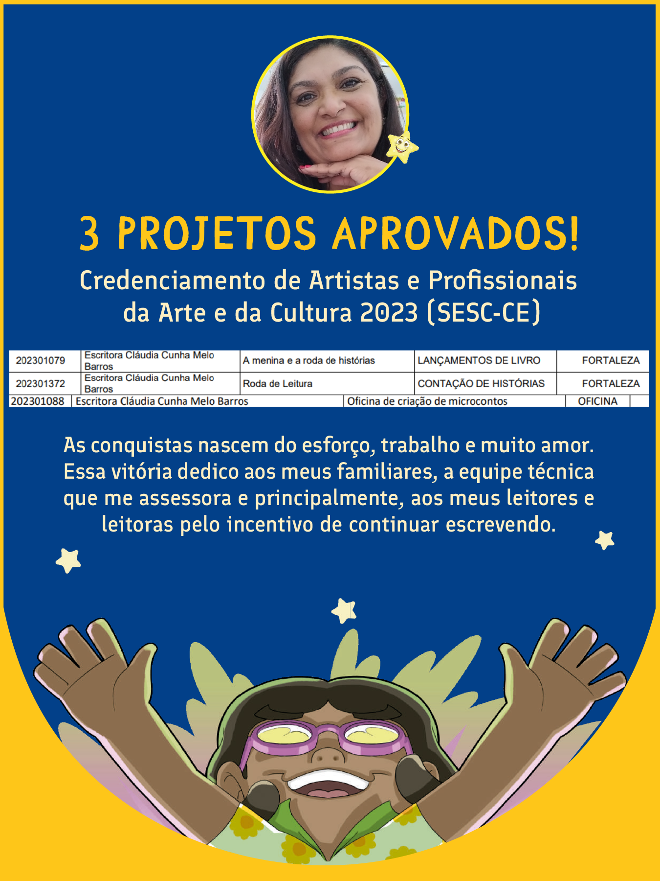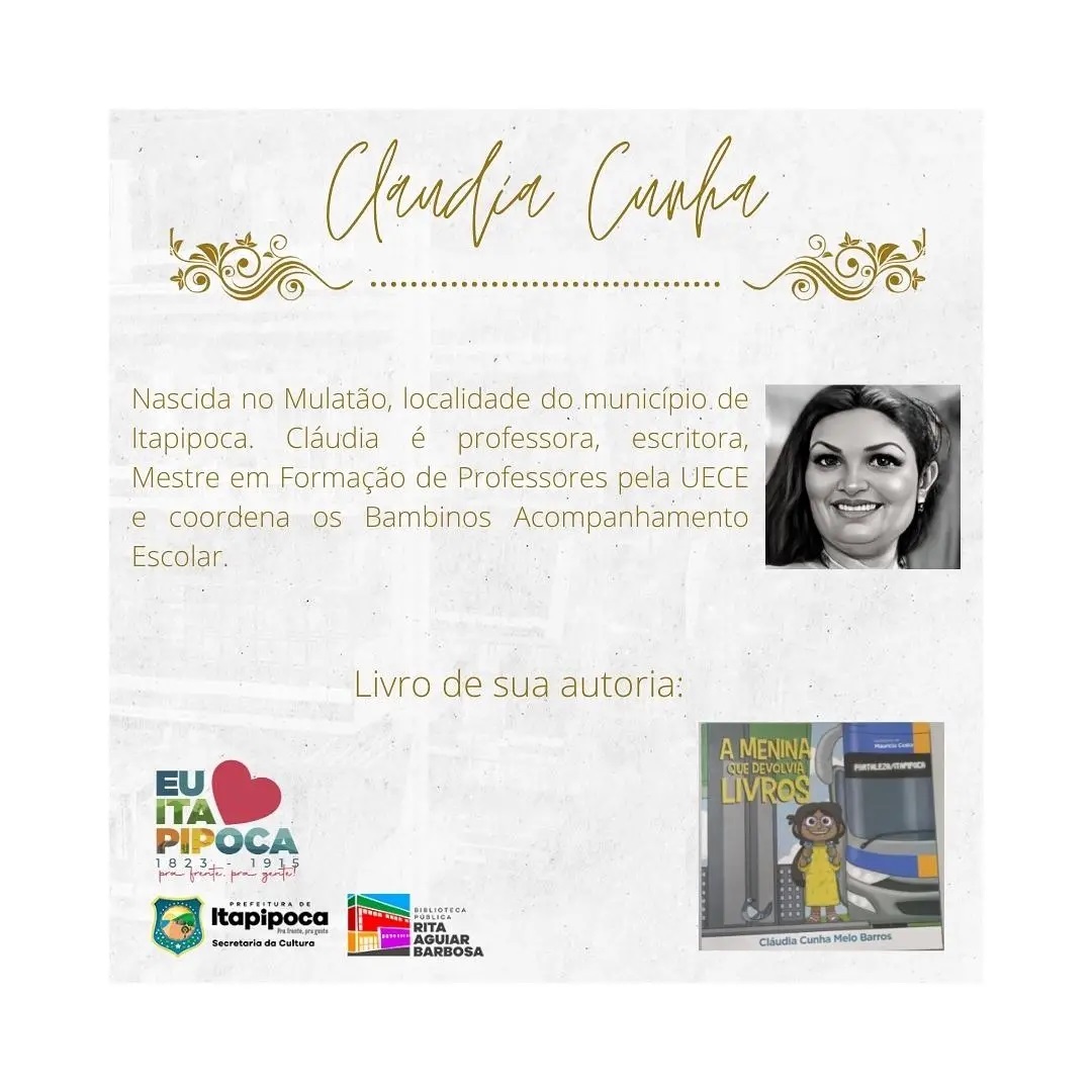 Sou professora e amo minha profissão! Sou escritora e leitora, faço questão de disseminar a valorização do livro, da poesia, do cordel, da produção local. Sei o quanto o livro tem sido negado à população em geral. É importante que a cultura leitora se transforme num direito de todos (as) e para todos (as)Vídeos