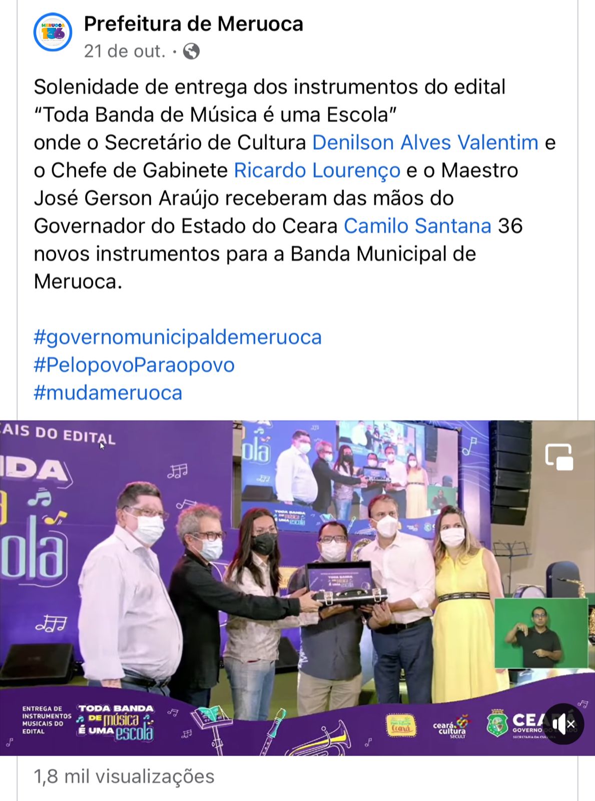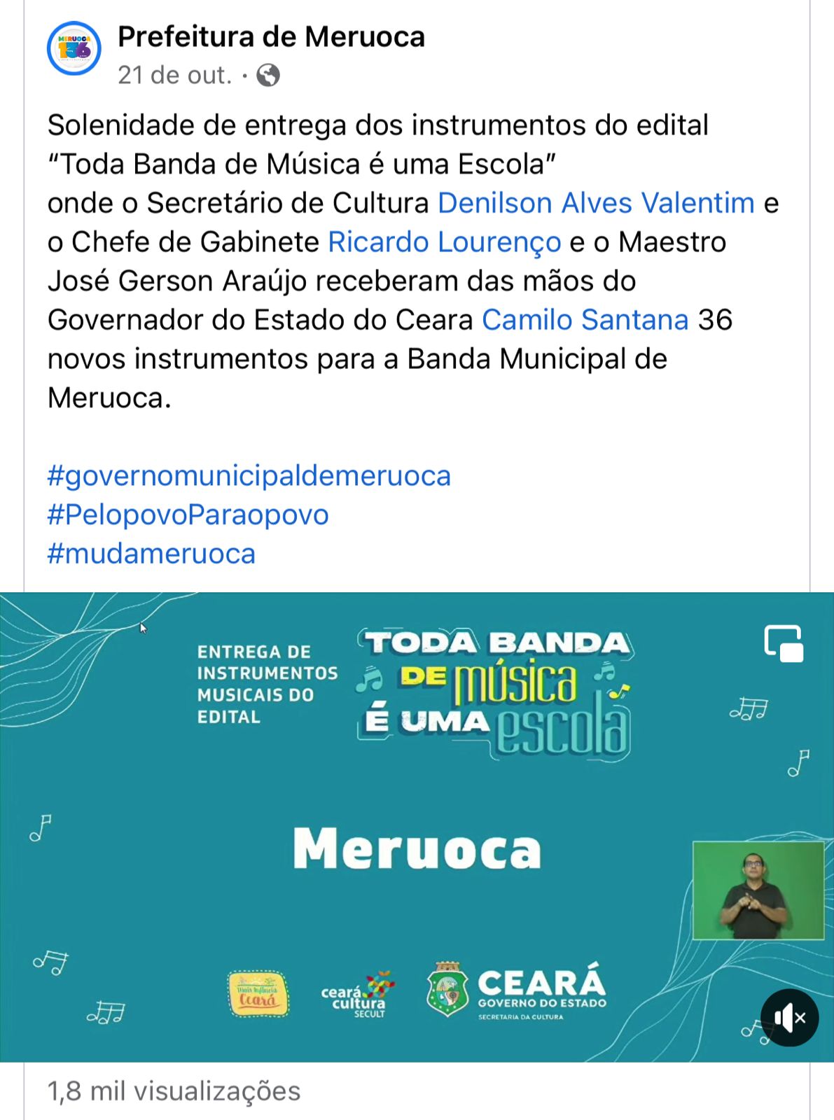 A Banda Música Municipal de Meruoca foi fundada no ano de 1990 pelo Monsenhor Jose Furtado Cavalcante (in memorian) pároco de Meruoca que solicitou ao Prefeito da época, Francisco Sanford Frota a criação da Banda de Música. Sendo encaminhada um projeto à Câmara Municipal de Meruoca com um pedido de compra de instrumentos musicais, partindo da grande necessidade de dar oportunidades de aprendizado de teoria e prática musical a crianças, adolescentes e jovens do município, com o objetivo de promovê-los em suas ocupações e formações pessoais.Vídeos