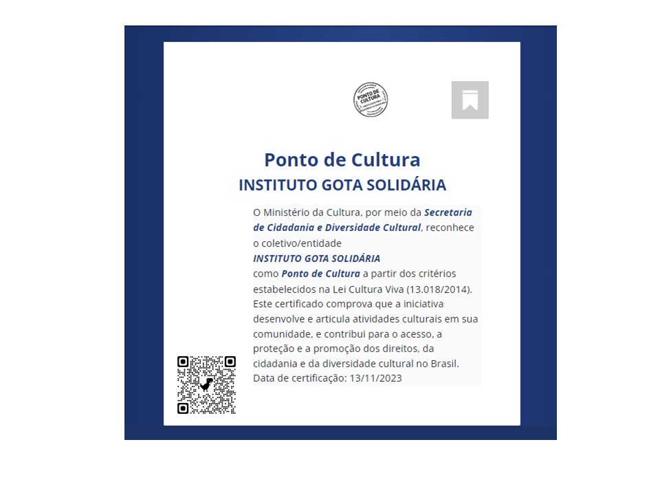 O Instituto Social de Arte, Cultura e Esporte Gota Solidária é uma organização da sociedade civil, sem fins lucrativos, que atua no fortalecimento das políticas públicas voltadas à promoção do desenvolvimento humano, social e comunitário na cidade de Fortaleza, Estado do Ceará. A instituição está registrada no Conselho Municipal dos Direitos da Criança e do Adolescente (COMDICA) sob o número 1148/25, no Conselho Municipal dos Direitos da Pessoa Idosa sob o número 085/2023, e no Conselho Municipal de Assistência Social, além de ser certificada como Ponto de Cultura pelo Ministério da Cultura, o que reforça sua legitimidade e reconhecimento como entidade atuante nas áreas de cultura, cidadania, assistência social e inclusão.Ao longo de sua trajetória, o Instituto vem acumulando qualificação técnica e experiência comprovada, consolidando-se como referência na execução de projetos sociais, culturais, esportivos e de capacitação profissional. A organização mantém parcerias estratégicas com o Governo do Estado do Ceará, o Programa Mais Nutrição, o Programa Mesa Brasil – SESC, a Ordem dos Advogados do Brasil – OAB, a rede Gerando Falcões, além de escolas, associações comunitárias e entidades locais, que fortalecem suas ações e ampliam seu alcance social.