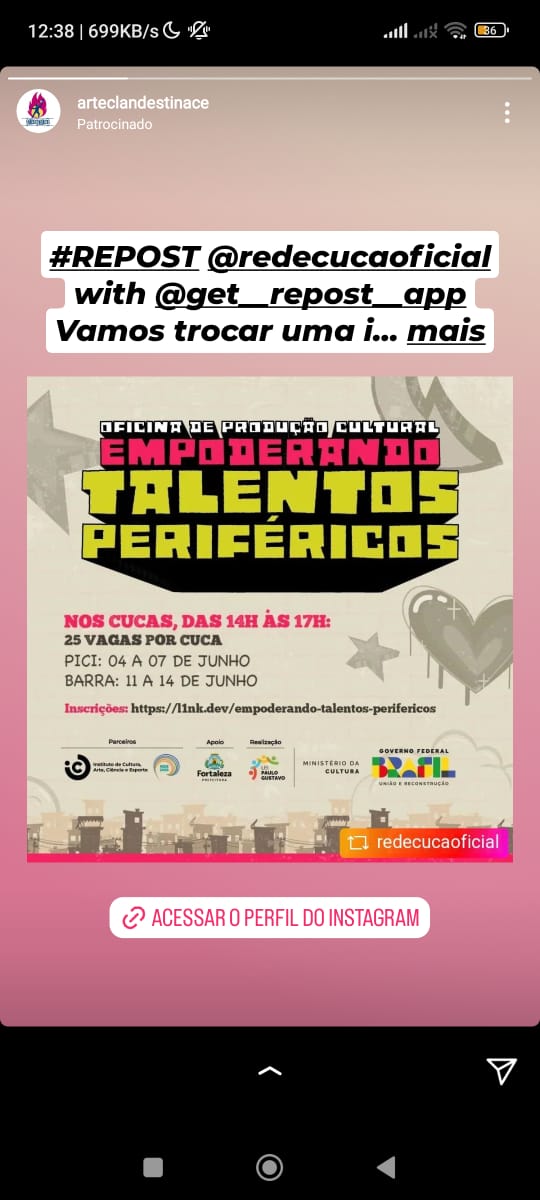 A Clandestino Produções Artísticas foi fundada com o compromisso de preservar a integridade nas práticas artísticas e culturais, ao mesmo tempo em que busca redefinir as narrativas convencionais através das artes visuais, cinema, audiovisual, fotografia, artesanato e economia criativa. Nasceu do desejo e entusiasmo por cultura, arte educação, com a vontade de conectar artistas, produtores e demais atores do cenário cultural. Utilizamos nossa experiência com educação e produção para realizar projetos culturais que transformam problemas sociais em produtos culturais.Através de suas iniciativas, a Clandestino não apenas proporciona entretenimento e cultura, mas também promove um diálogo crítico sobre questões contemporâneas relevantes para as comunidades atendidas, estabelecendo conexões e responsabilidade social a partir de projetos realizados através da captação de recursos por inúmeros meios.