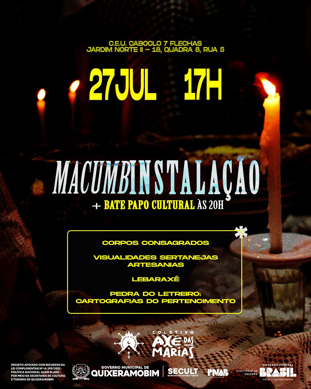 O Ponto de Cultura Caboclo 7 Flechas é um espaço de resistência, memória, criação e fortalecimento das culturas populares e dos povos de terreiro, situado no território sertanejo, onde a espiritualidade, a ancestralidade e a arte caminham juntas como instrumentos de educação, identidade e transformação social. Inspirado na força simbólica do Caboclo 7 Flechas — entidade que representa proteção, sabedoria, coragem, justiça e ligação profunda com a natureza e os encantados da terra — o Ponto de Cultura atua como um guardião dos saberes tradicionais e das expressões culturais afro-indígenas no sertão.O Ponto de Cultura Caboclo 7 Flechas desenvolve ações continuadas voltadas à valorização das tradições de matriz africana, indígena e sertaneja, promovendo atividades culturais, educativas e comunitárias que fortalecem o pertencimento, o respeito à diversidade religiosa, étnico-racial e cultural. Suas ações dialogam com a oralidade, a musicalidade, a dança, os rituais, a educação patrimonial, o audiovisual, as artes visuais, a fotografia, a literatura e os saberes populares transmitidos entre gerações.