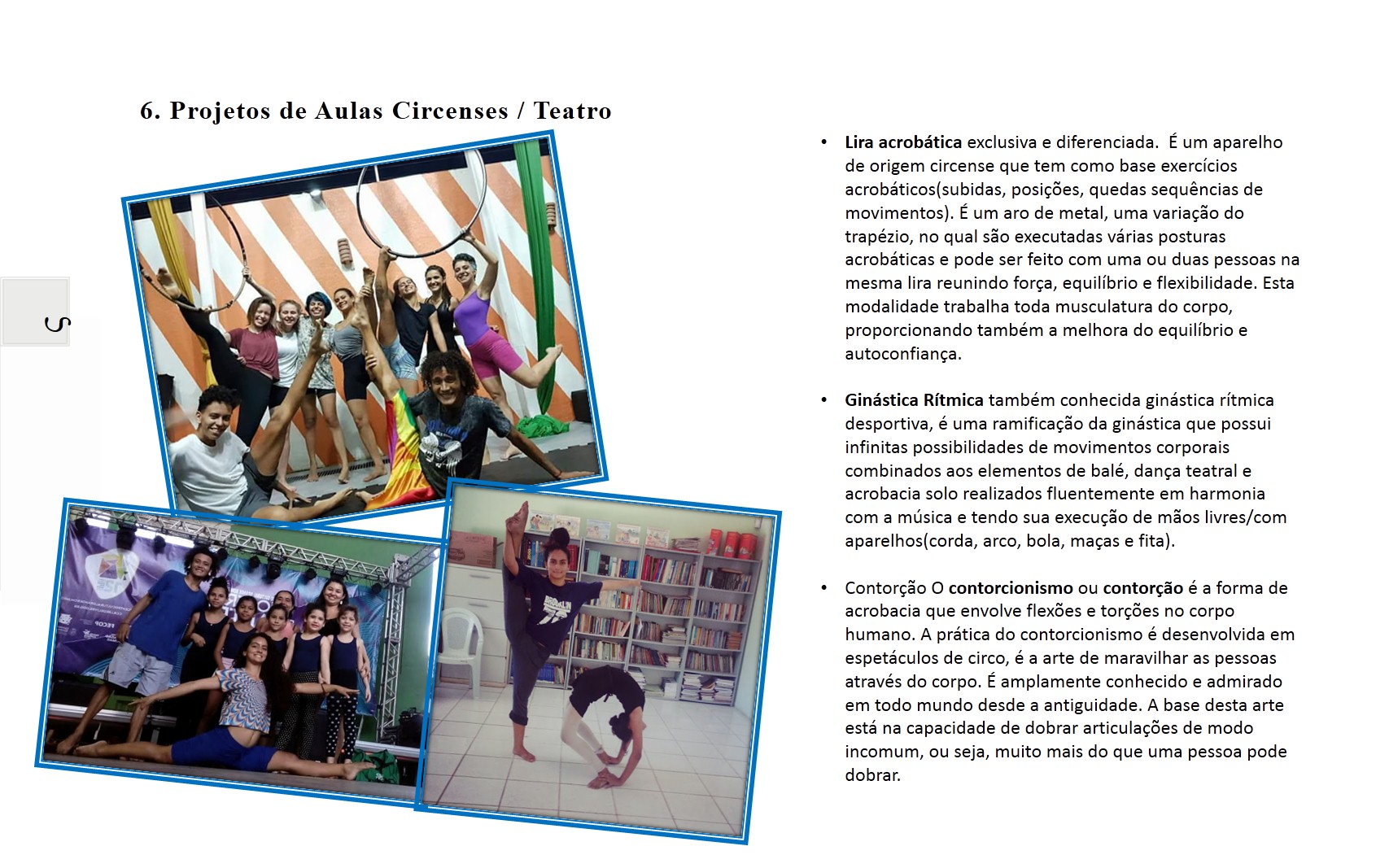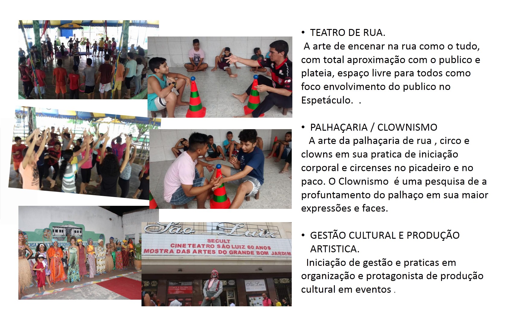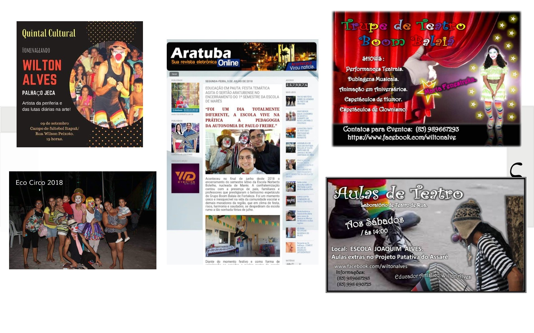 Boom Balaia Circo Teatro É um coletivo de Artistas Independentes existentes em nosso território Artístico Circense, Localizado na Região do GBJ – Grande Bom Jardim – Fortaleza. CE. Que tem sua Areia um Celeiro de Cultura, uma região múltiplo cultural, com: Artes Cênicas, Artes Plásticas, Artes Circenses, Musica, Artesanatos, Cultura Digital, Literatura, Patrimônio Cultural e Manifestações Culturais e Populares. Com Sede –Provisório na ACDG. (Endereço: Rua. Sabino Filho – 1110. Siqueira. Fortaleza. CE). O Ciclos das Artes é uma união de inovações e organização de grupos, artistas, produtores, idealizadores e apoiadores no incentivo da Produção Cultural, da Sustentabilidade com a Cultura, com as Diversidades Artísticas, Patrimônio Cultural, Convivência e Vivencias, e Desenvolvimento de Políticas de Cultura em nossa região, com objetivos com a Cultural e a Artes, acesso ao teatro e o circo livre para todos, projetos sociocultural e com o incentivo das práticas de fazer Artes Livre em Nosso Estado. “Já que estamos e estamos aqui, aqui estamos e estamos aí. Apesar dos pesares, estamos vivos”. É parafraseando essa música que anunciamos o retorno do movimento artístico cultural do Siqueira, vamos continuar mantendo vivo o nosso fazer arte e cultura dentro do bairro. Já que ainda não podemos fazer da forma certa que é pra ser feito, ao vivo e presencial, estaremos realizando um “ao vivo” só que pela internet. Reforçar a frase “O espetáculo não pode parar” nunca foi tão necessária, observando esse período de pandemia em que estamos passando. A arte que também cura através dos risos causados pelo contato direto, tentaremos proporcionar pela rede social, por conta do distanciamento social(quase um pleonasmo).APRESENTAÇÃO DE ESPETÁCULOS