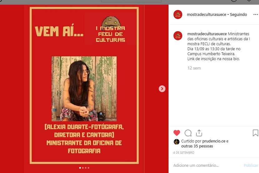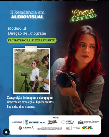 Alexia Duarte é fotógrafa, produtora cultural e realizadora audiovisual, atuante desde 2013. Iniciou sua trajetória artística ao adquirir sua primeira câmera fotográfica, realizando ensaios pelas ruas históricas de Icó, interior do Ceará. Participou de coletivos artísticos promovendo de saraus, exposições fotográficas e performances em festivais. Trabalha como fotógrafa, editora e videomaker na produção de conteúdos audiovisuais para artistas e empresas locais.