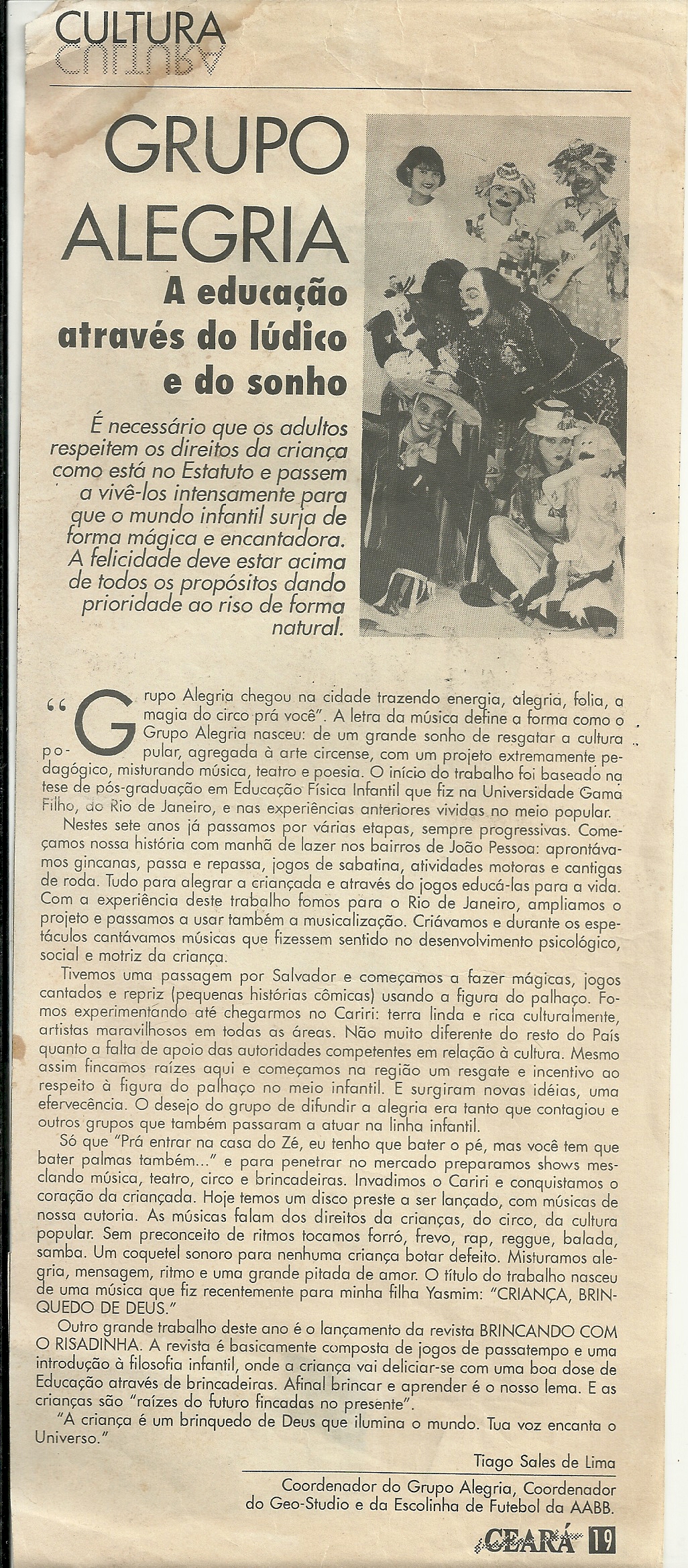 O Teatro de Mamulengo Jacarandá foi criado nos anos 80 pelo professor e artista popular Tiago Sales, também conhecido como o Palhaço Rizadinha. Inspirado pelas peripécias de Cassimiro Coco e suas histórias engraçadas contadas nas feiras livres, o professor se encantou com o universo do mamulengo e, com sua visão criativa, fundou seu próprio teatro. O nome "Jacarandá" foi escolhido em homenagem à música popular "Boca de Forno Jacarandá", que, assim como o teatro, é um ícone da cultura local.A companhia começou a criar histórias engraçadas, baseadas no cotidiano de seu bairro, em Juazeiro do Norte, trazendo personagens e situações que se tornaram populares entre os moradores. Tiago Sales, com sua habilidade de contar histórias e sua relação com o humor, logo se destacou como um bonequeiro popular, encantando o público com suas narrativas e performances. Ele compreendia o poder do riso e da alegria como ferramentas de entretenimento e reflexão, criando um espaço único para a interação entre o público e o teatro.