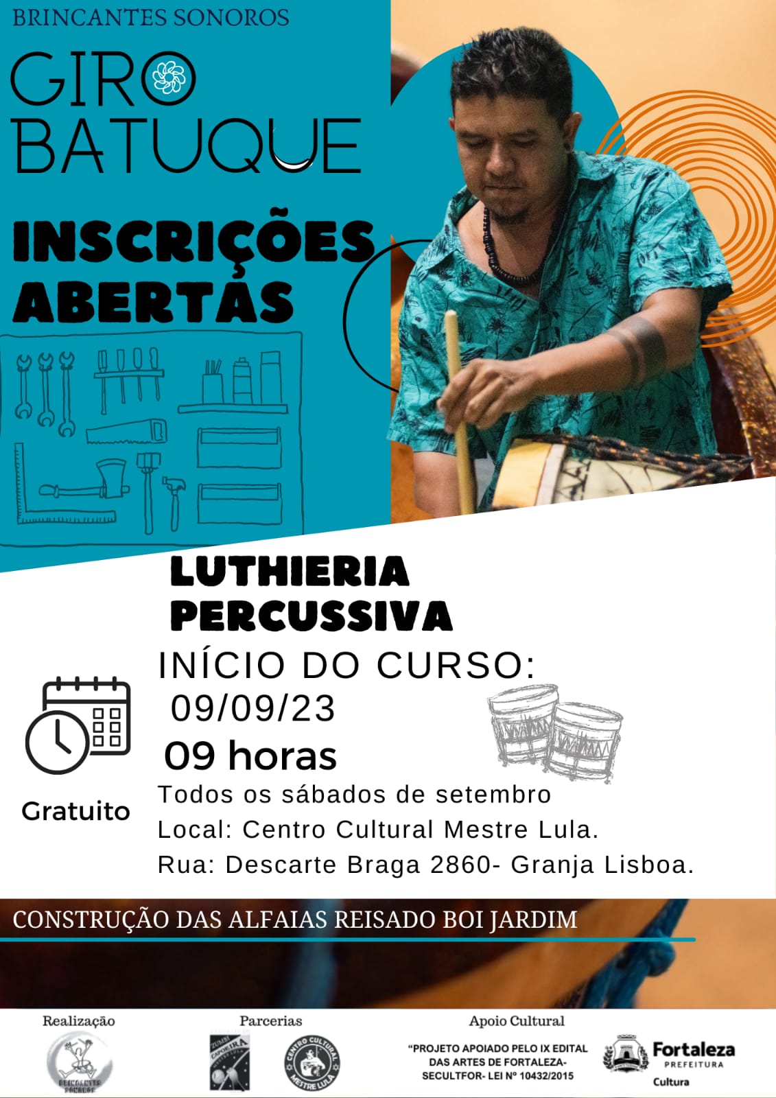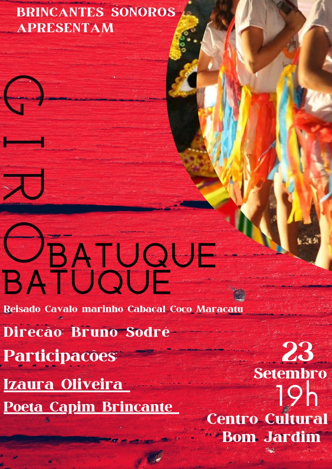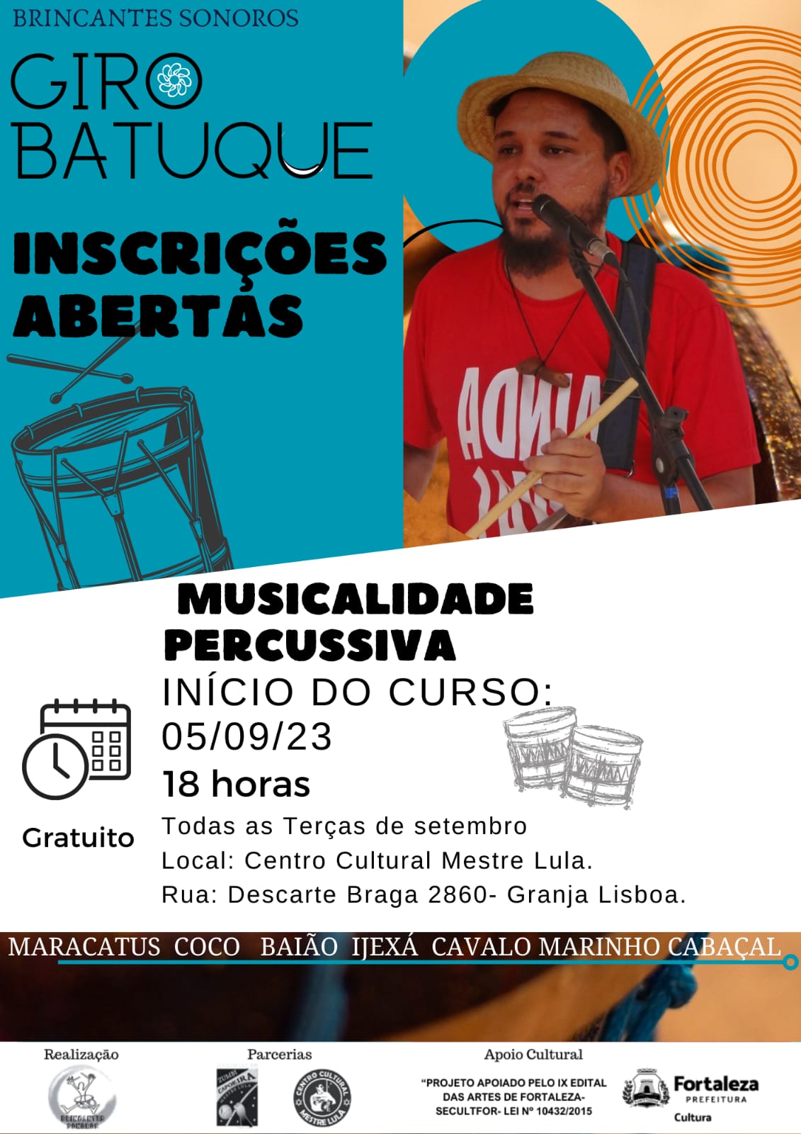 tem projeto de cuirculação as escolas públicas intitulado Giro Batuque realizando formação em musicalidade percussiva e de cultura popular.