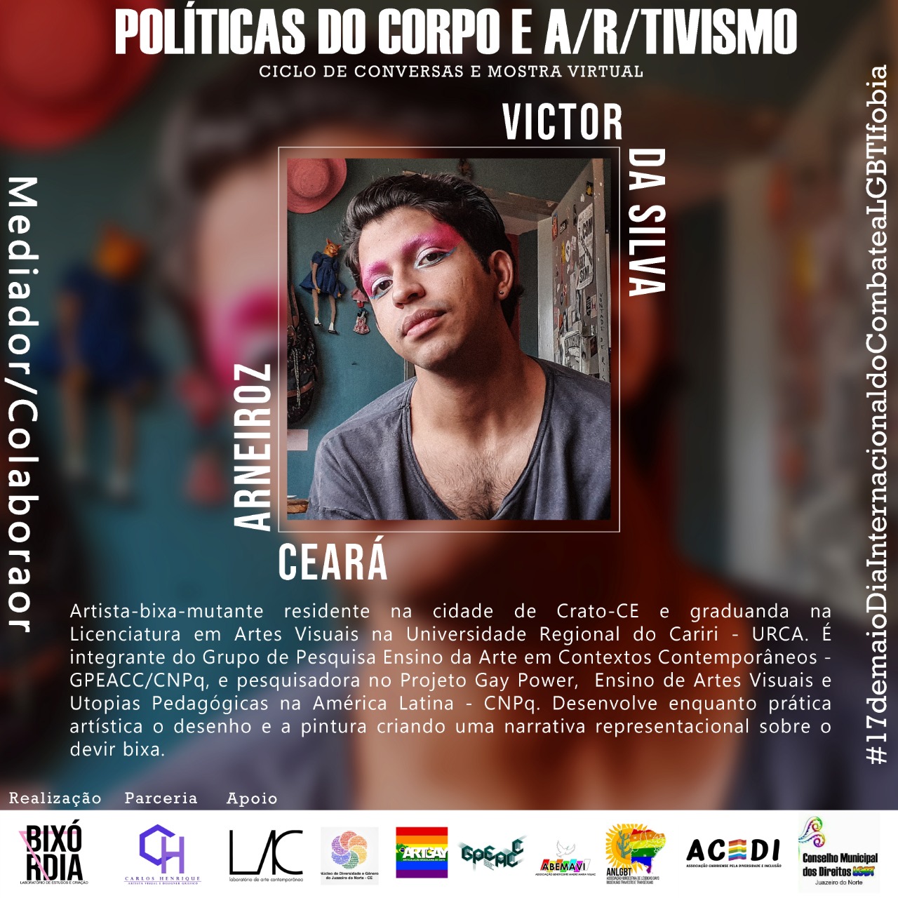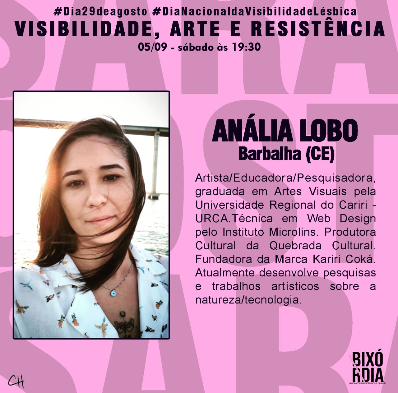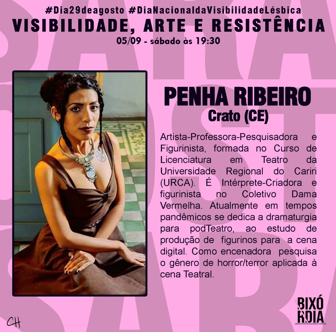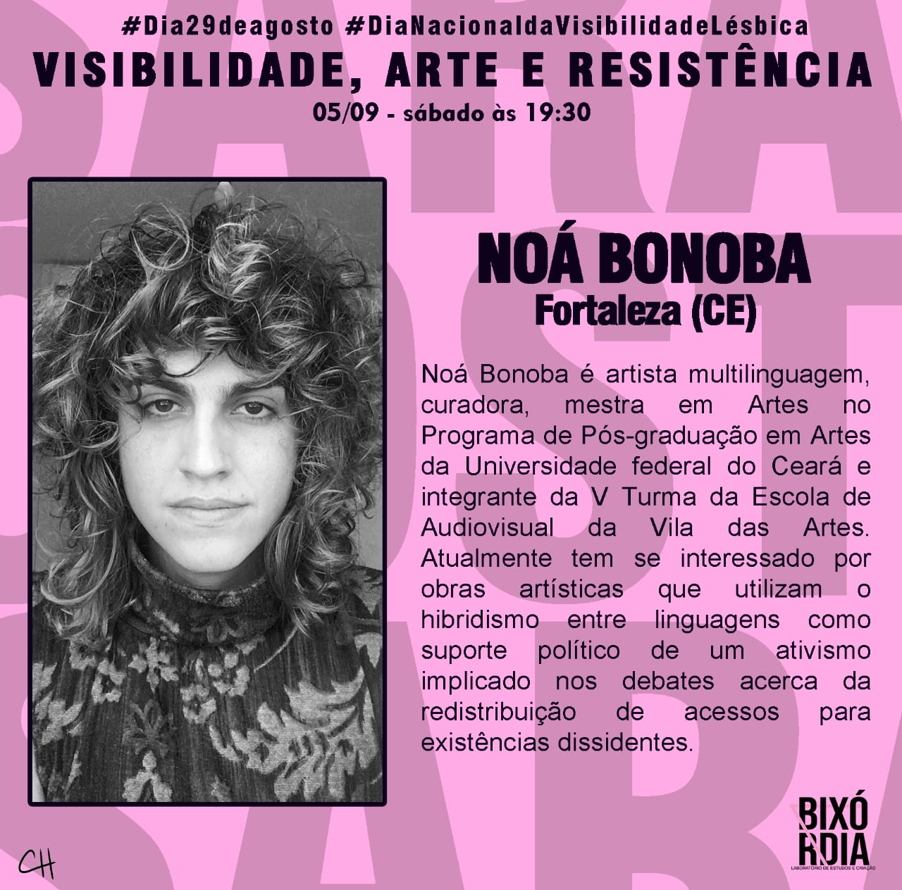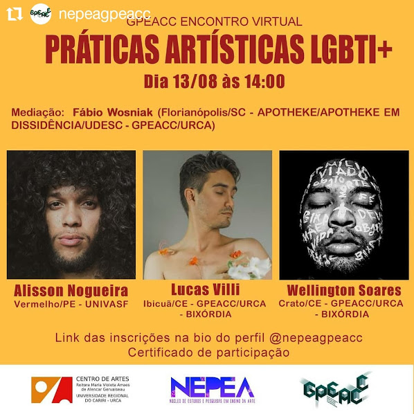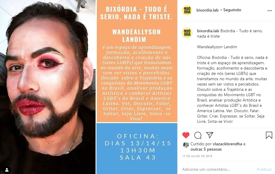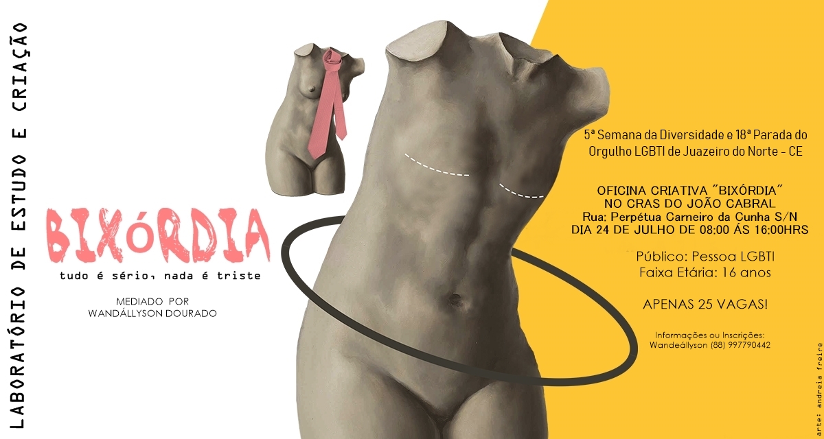 O Laboratório de Estudos e Criação - BIXÓRDIA surgiu a partir de uma atividade realizada na Semana de Acolhimento Estudantil no semestre 2018.2, no Centro de Artes Reitora Maria Violeta Arraes de Alencar Gervaiseau - URCA, realizada pelos Centros Acadêmicos de Artes Visuais e Teatro, onde nasceu a oficina intitulada “Bixórdia – Tudo é sério nada é triste”. A proposta surgiu a partir de tensões e questionamentos da invisibilidade de práticas artísticas LGBTIs ao longo da História da Arte. A partir da escuta e compartilhamento de experiências enquanto bixa (gay) e com as vivências cotidianas com Lésbicas, Gays, Travestis, Transexuais, Intersexuais (LGBTI), mulheres, negros/as onde pudemos ouvir e ver outras possibilidades de discursos, narrativas e estratégias, buscando por meio da oficina repensar e reelaborar as imagens que nos cerca no cotidiano (revistas, jornais, posters, site, tv, etc.), possibilitando uma reflexão-crítica por meio de outras imagens construídas através de colagens. Então, a partir desta oficina deu-se origem ao Laboratório Bixórdia, como um espaço de formação estético-artística, de produção e gestão cultural autônoma.Vídeos