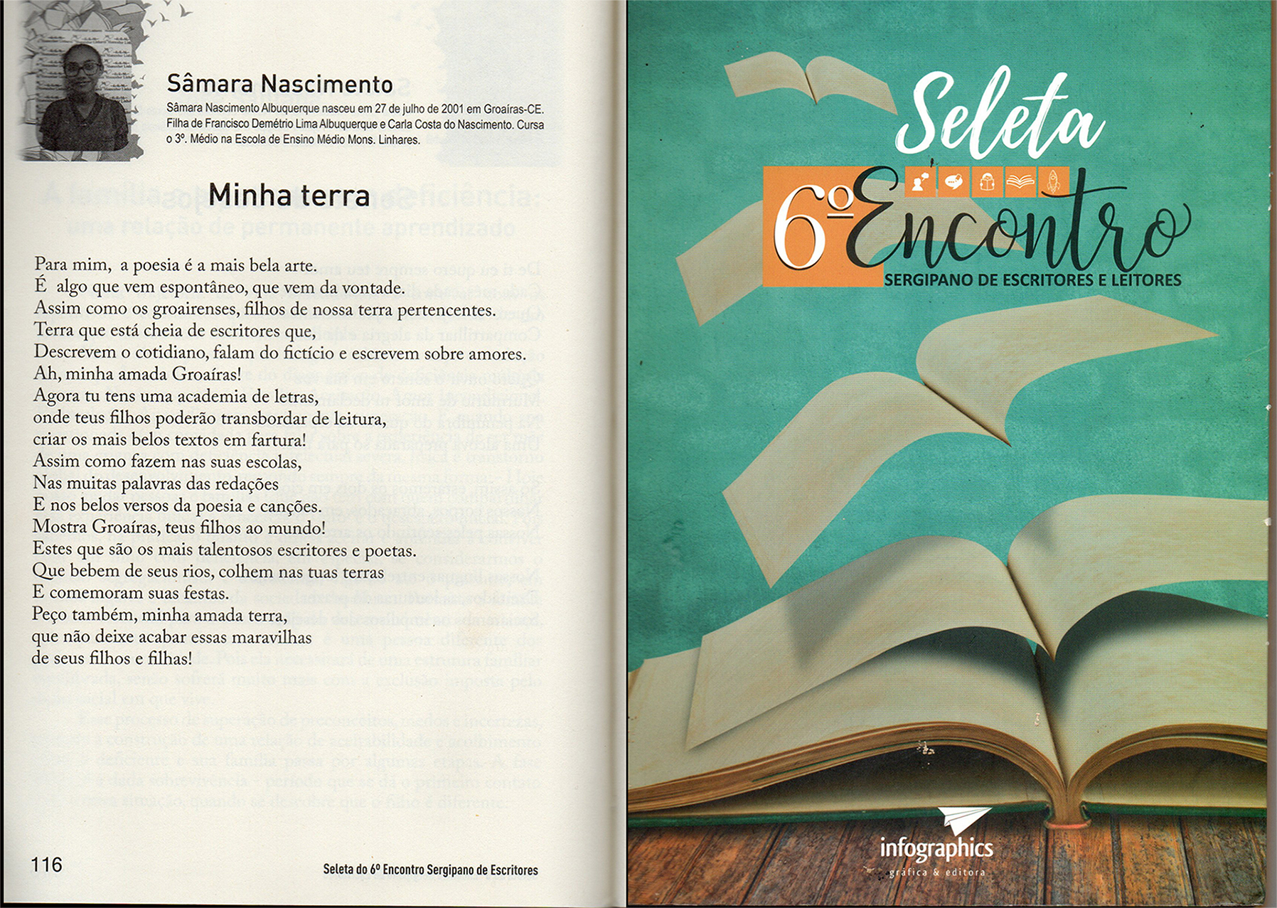 Ago/2018- Poesia "Minha terra", publicada em livro "Seleta 6º Encontro Sergipano de Leitores e Escritores- Autora Sâmara - Editora inphografics