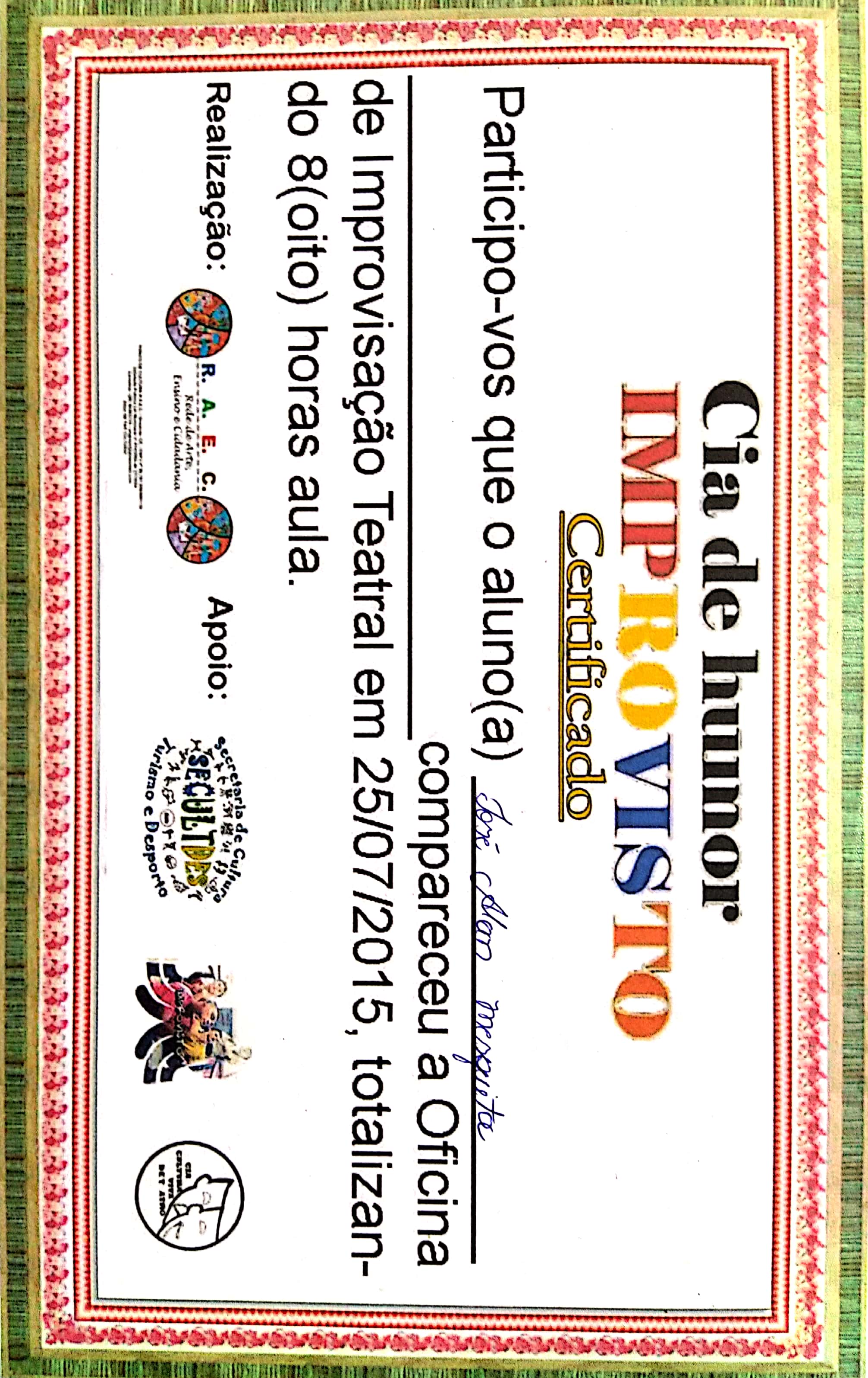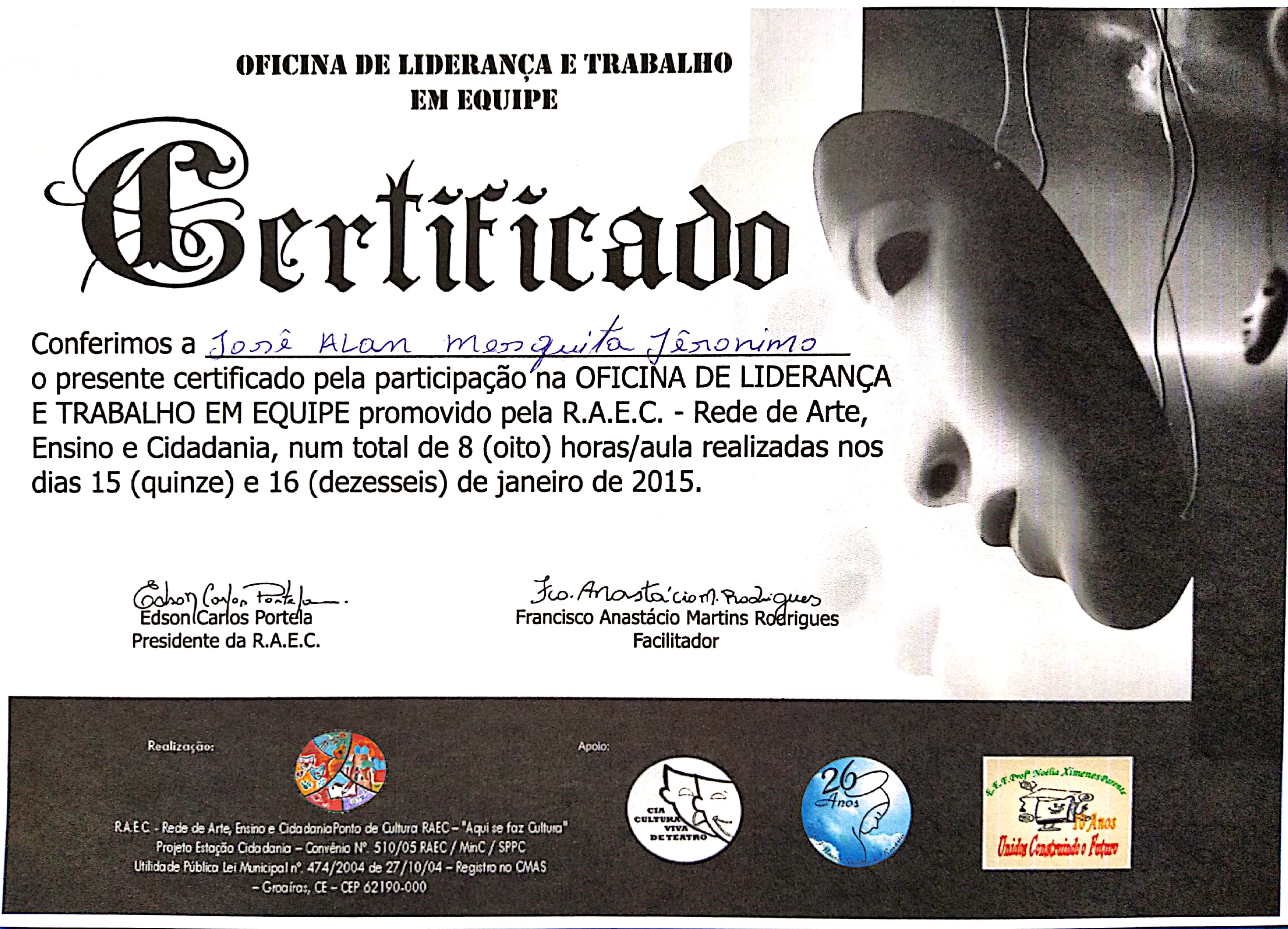 2015 - Apresentação da peça “ Ecoa” Dirigida por Edson Portela e Texto de Denis Melo no Evento:I Feira de Ciências e matemática da SEDUC Groaíras na E.E.F. Profa. Noélia Ximenes Parente- Groaíras- Ceará; Participação da Oficina de expressão corporal – Marinah Brito e Juliana Veras – Grupo de Expressões Humanas de Fortaleza no ECOA (Escola de Artes e Ofícios) – Sobral – Ceará; Participação da Oficina de Fantoches – Grupo Ânima , de Fortaleza no ECOA- Sobral-Ceará; Oficina de liderança e trabalho em equipe promovido pela R.A.E.C – Rede de Arte, Ensino e Cidadania; Oficina de improvisação teatral com a Cia. De humor IMPROVISTO;
