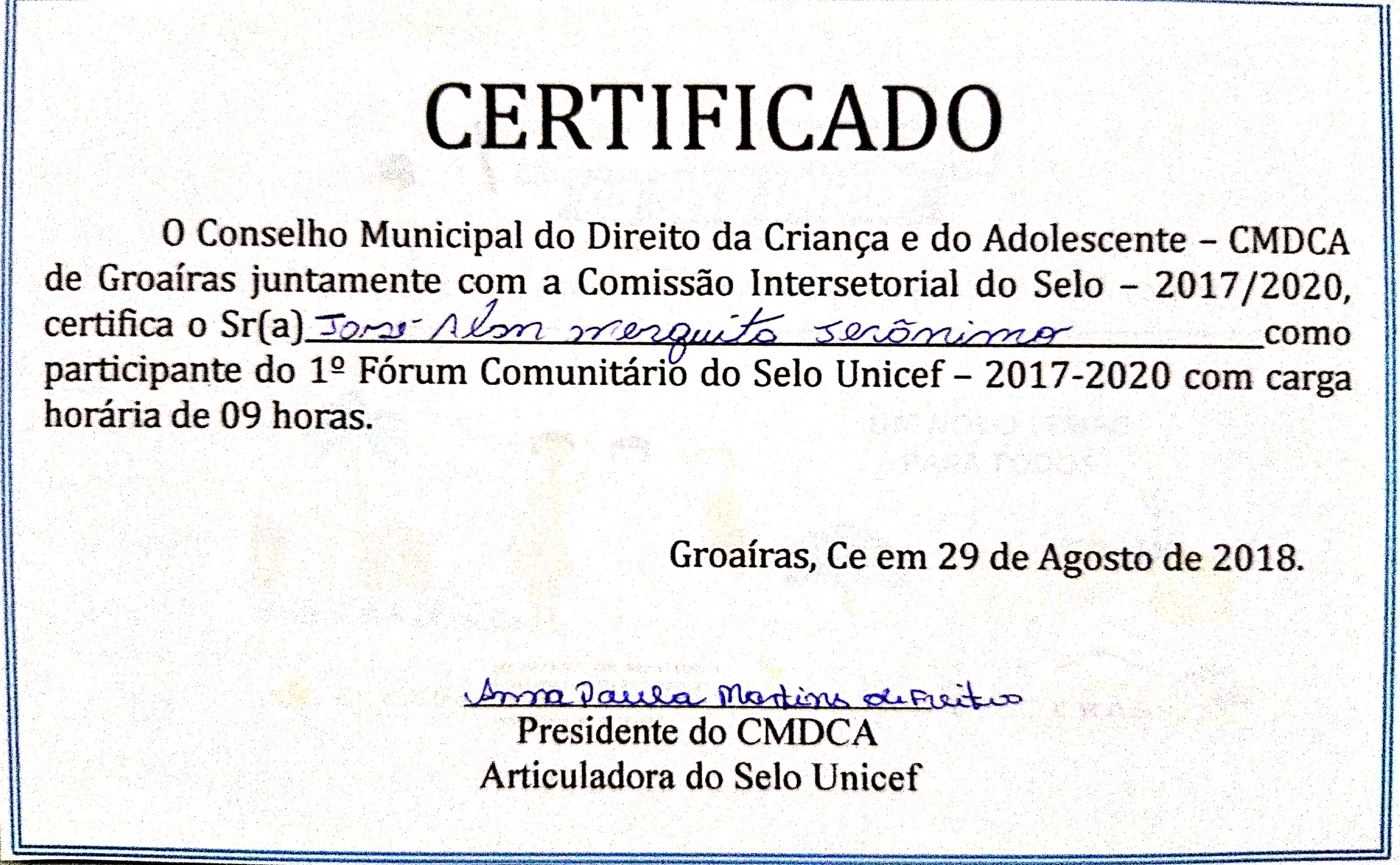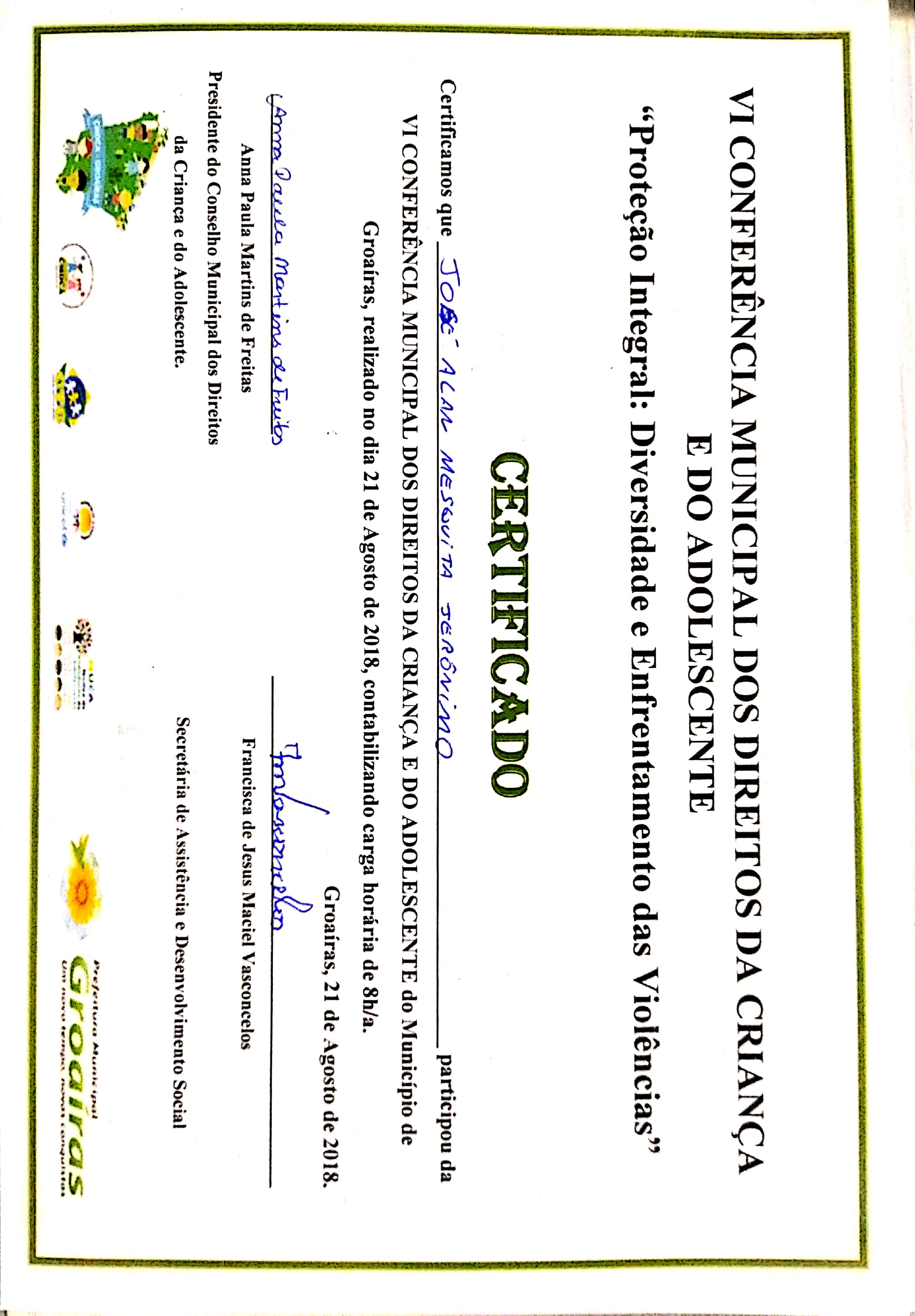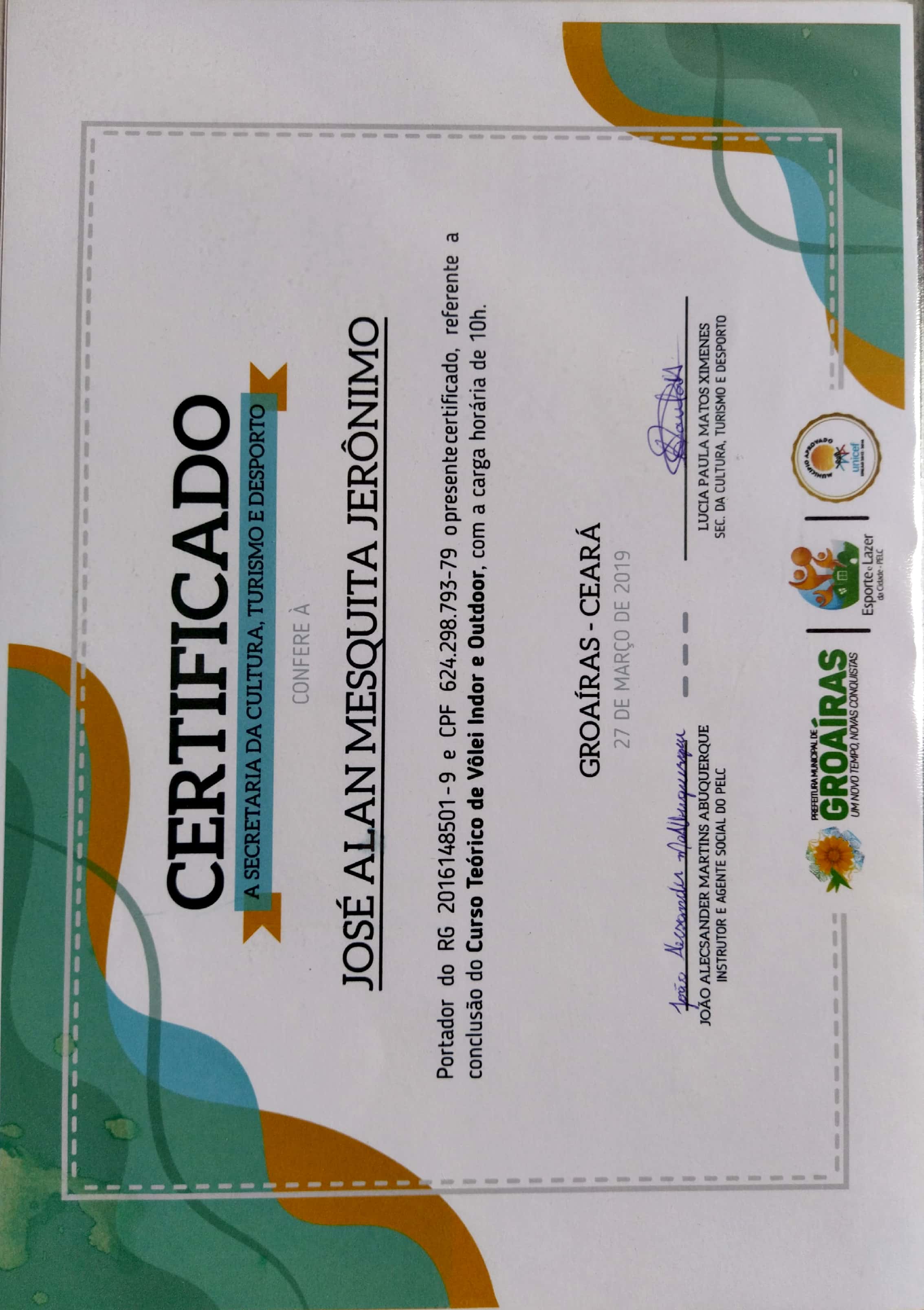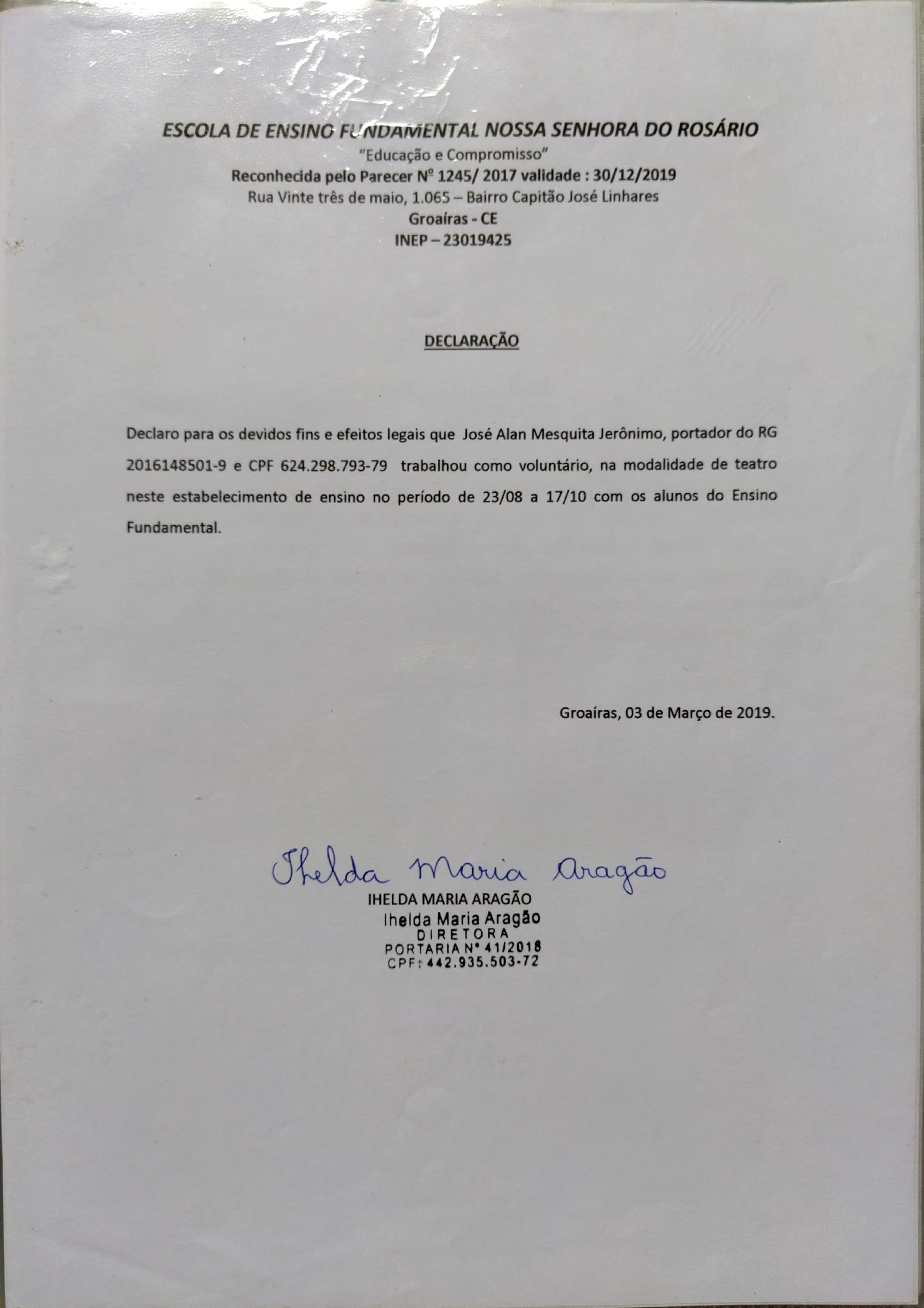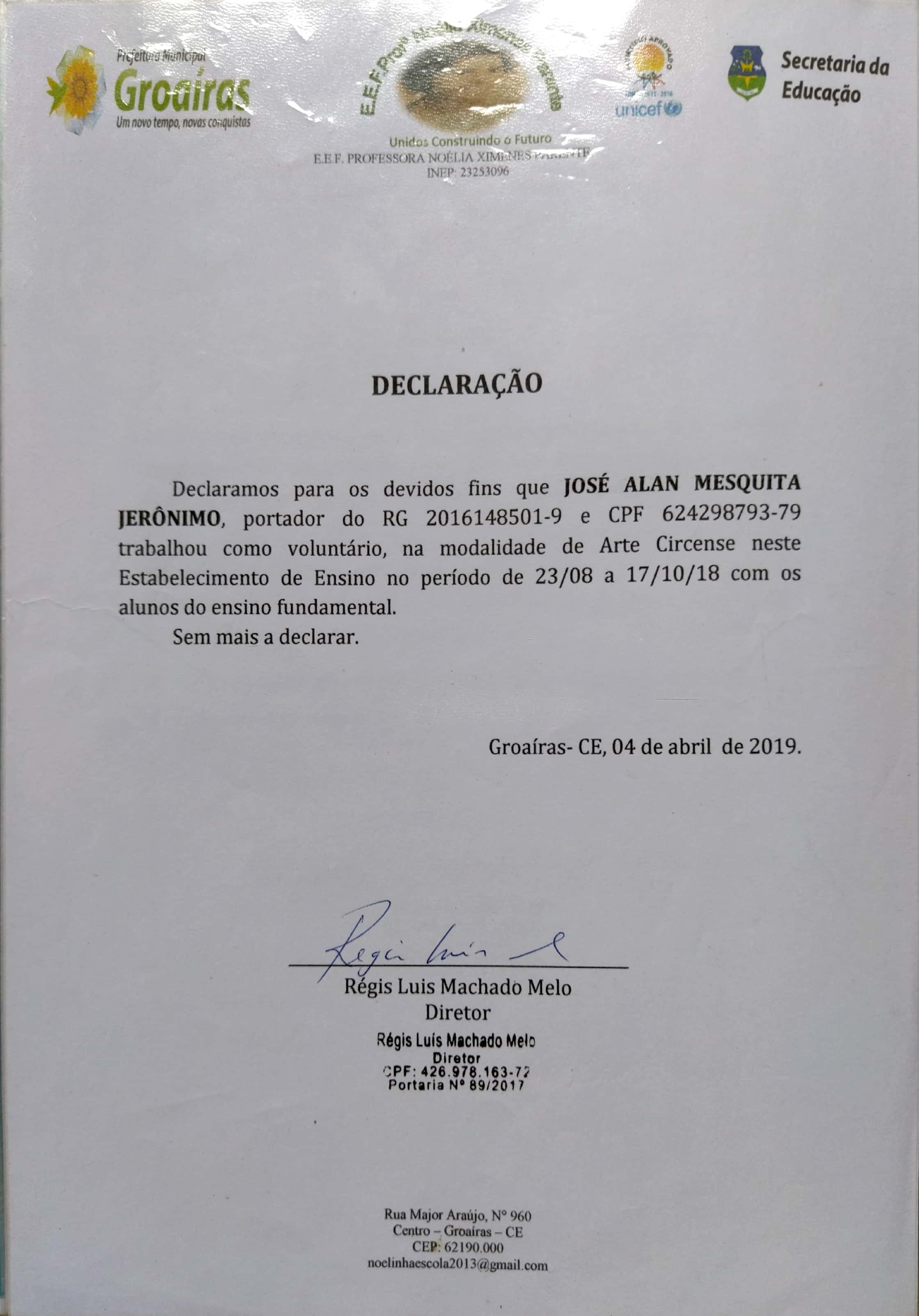 2019 – Apresentação de esquete teatral “circo” e Jogos e brincadeiras na Colônia de férias do Colégio Fco. Quirino em Cariré; Apresentação do poema “Groaíras”,na Final da 21º copa 23 de maio no Estadio Municipal de Groaíras; Direção na apresentação “PELC” no Evento do PELC- no Mercado Central de Groaíras; Oficinas de teatro na E. E. F. Nossa Senhora do Rosário; Oficinas de artes circense na E. E. F. Noelia Ximenes Parente; Oficinas de teatro na E. E. F. Júlia Elisa Farias;