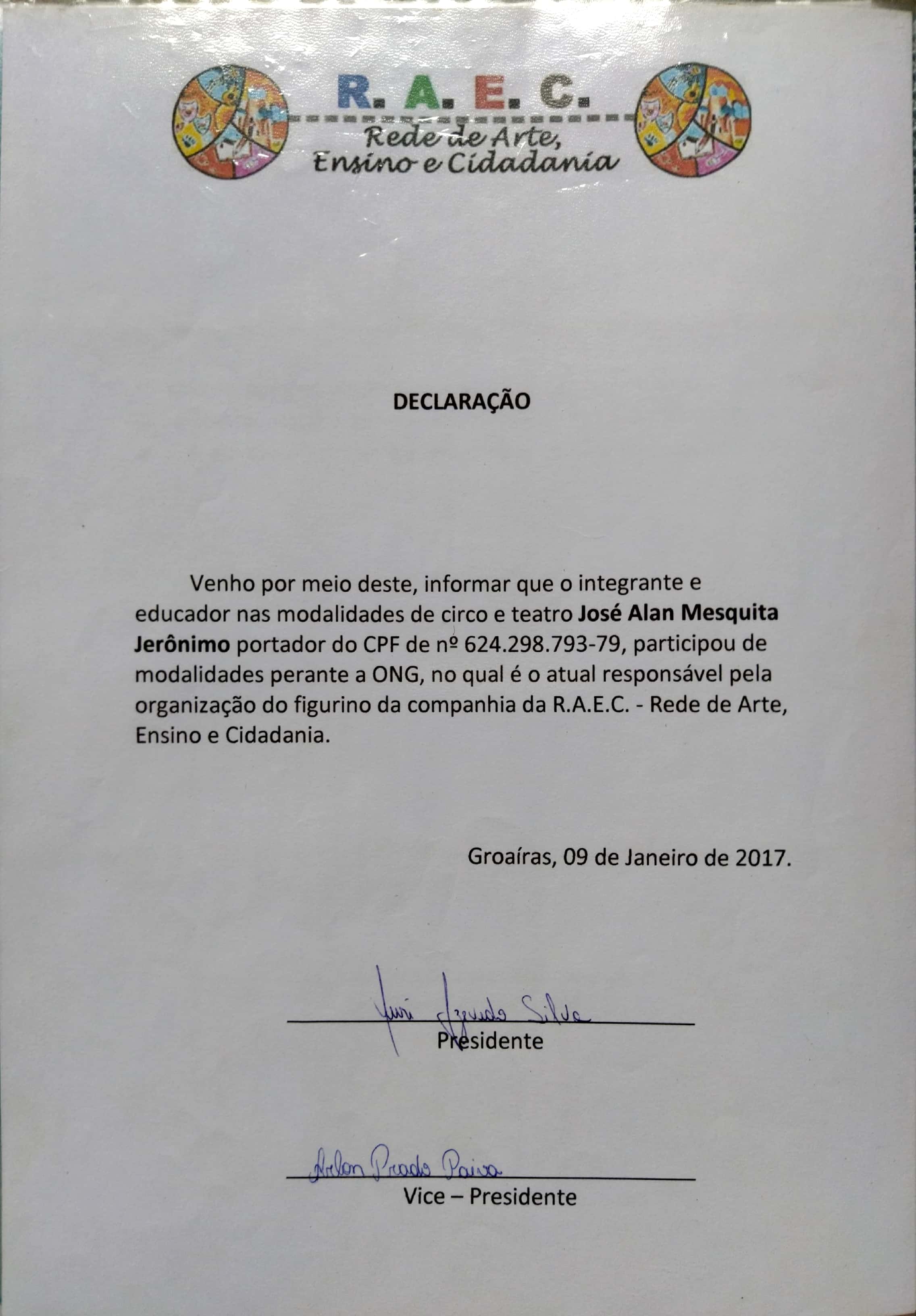 2017 – Inicio do projeto de oficinas teatrais para crianças e adolescentes na comunidade de Córrego dos Matos,Instrutores variados da Cia na Igreja Católica- Corrégo dos Matos- Groaíras; Apresentação da esquete teatral “ Historinha de amor”- Direção e texto- João Azevedo no Cras Mimi Marinho- Sobral; Realização de Oficinas de malabares (Circo). Na Sede da Cia. Cultura Viva de Teatro; Realização de Oficinas de Circo na rua com a apoio do integrante da cia cultura viva de teatro Danilo Almeida na Praça Padre Mororó-Groaíras-CE; Monitor do projeto Mais educação no 2º semestre da unidade de ensino da E. E. F. Nossa Senhora do Rosário; Oficineiro de Arte-educação (teatro, arte circense) e direção de apresentações artísticas nos coletivos do centro de convivencia e fortalecimento de vinculos ( C.C.F.V);