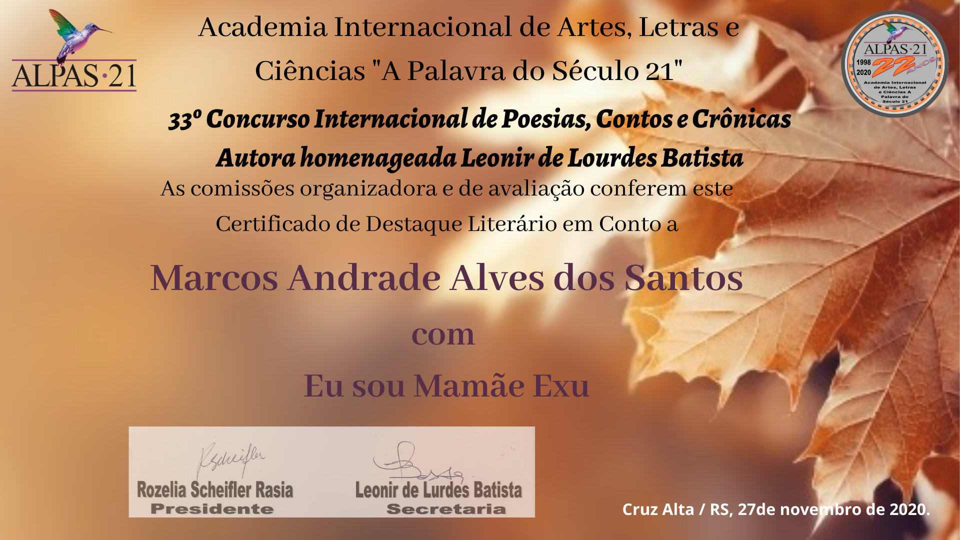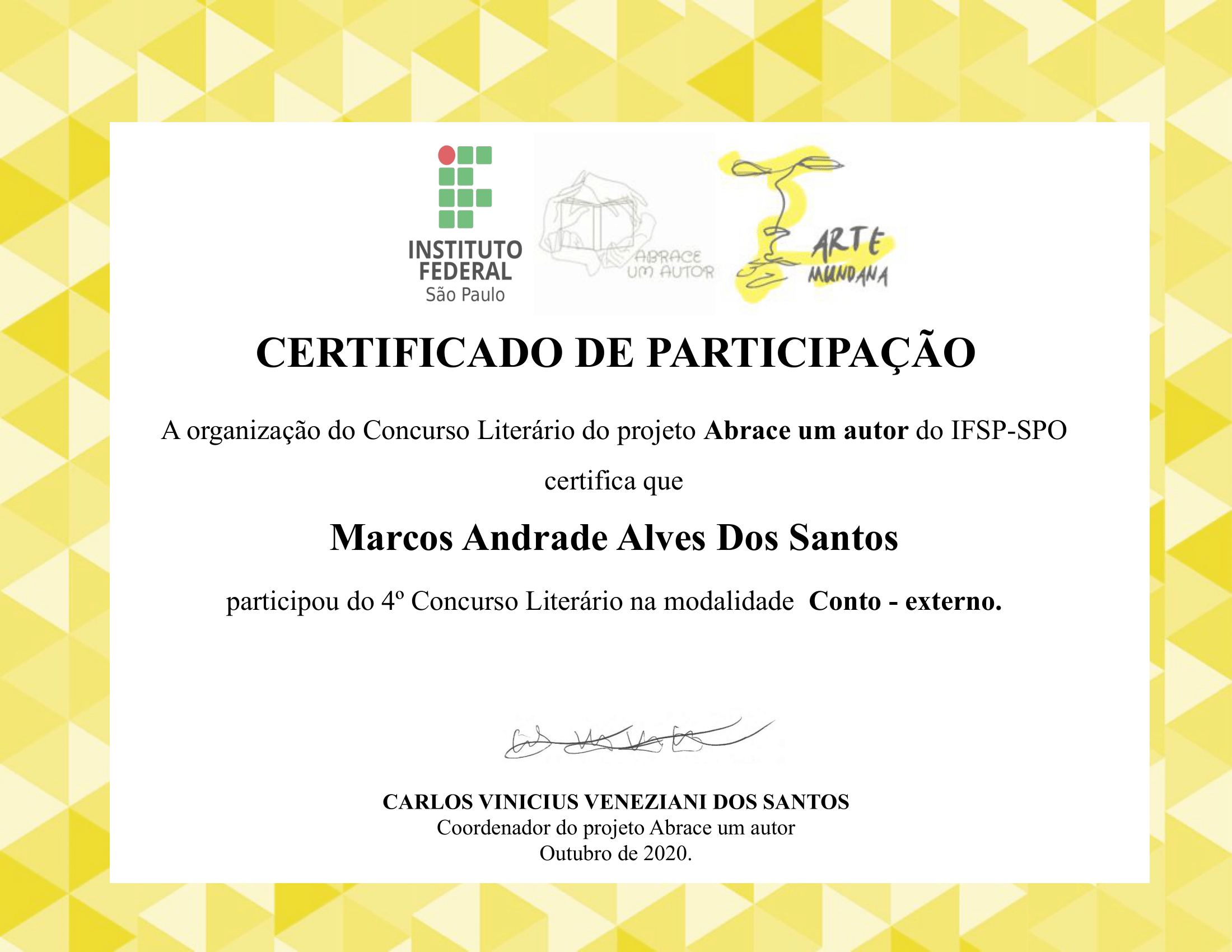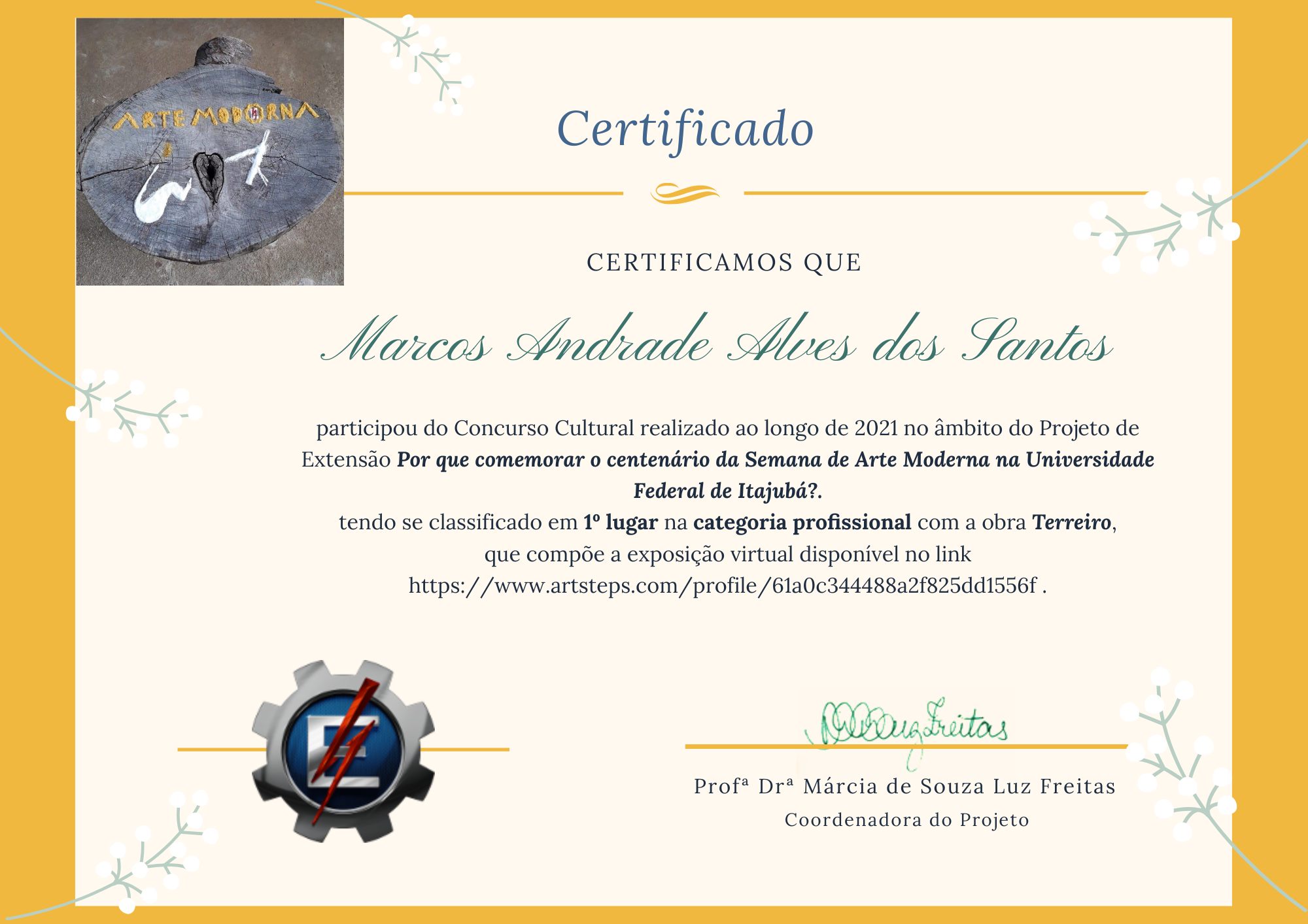 Vencedor do Concurso Cultural em homenagem a Semana de Arte Moderna da Universidade Federal Itajubá -1º Lugar, Categoria Profissional, Modalidade Texto, Poesia: Terreiro.