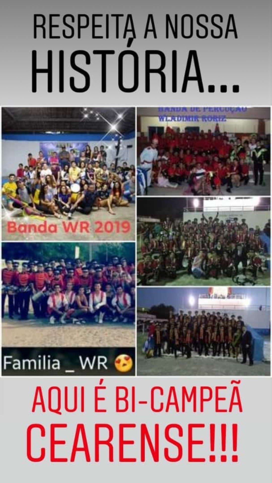 A Banda de Percussão WR, fundada em 1º de junho de 2010 com o intuito de retirar os jovens da ociosidade, dando-lhes uma ocupação prazerosa. A referida banda é conhecida na região por abrilhantar os desfiles cívicos e também nas disputas de festivais de bandas. Sagrou-se Campeã Cearense de Bandas em 2013 e repetiu o feito em 2016.Vídeos