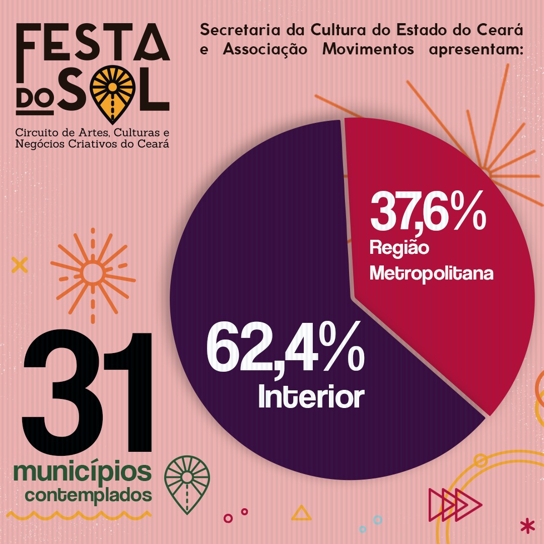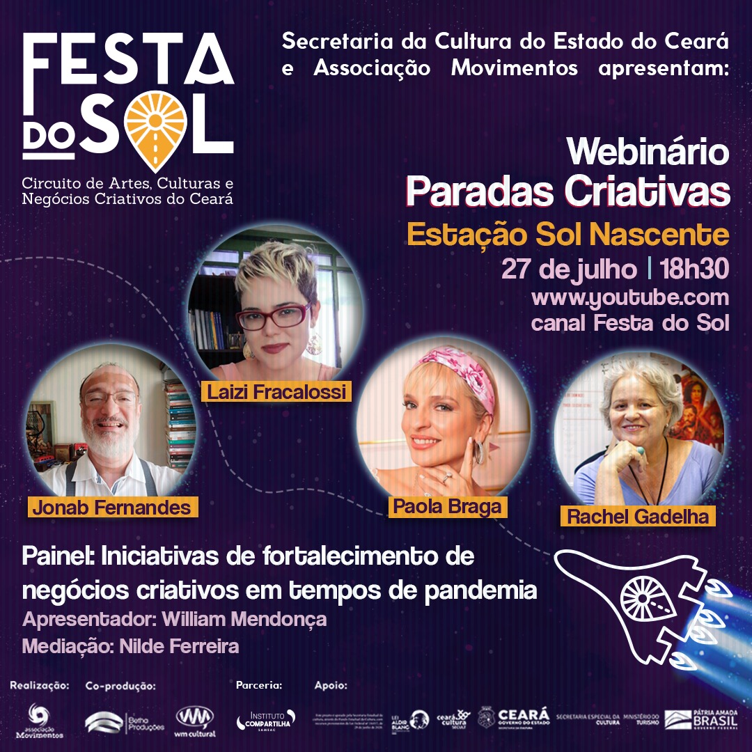 Idealizadora e coordenadora do projeto FESTA DO SOL – CIRCUITO DE ARTE, CULTURA E NEGÓCIOS CRIATIVOS DO CEARÁ. Um termo de cooperação entre o estado e a Associação Movimentos Projeto vencedor do edital de chamamento público para programação em espaços públicos e privados da SECULT CE por meio da Lei Aldir Blanc. Um festival multicultural que contemplou todas as macrorregiões do estado com variadas linguagens artísticas realizado no período de janeiro a setembro de 2021.