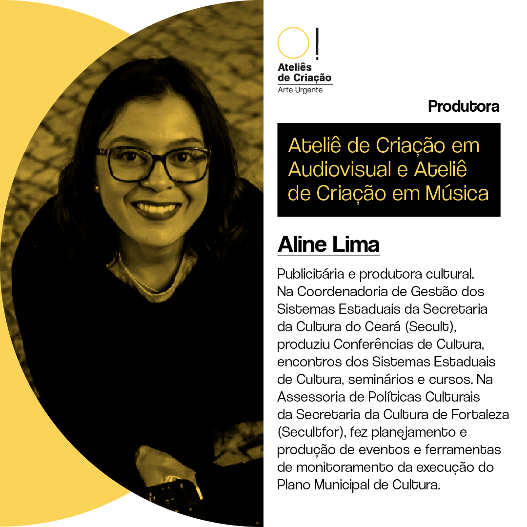 Aline Lima é publicitária e produtora cultural, trabalha em projetos culturais voltados ao desenvolvimento humano via arte e comunicação.Foi responsável pela comunicação da Coordenadoria de Gestão dos Sistemas Estaduais da Secretaria da Cultura do Estado (Secult), tendo criado o acompanhamento de grupos de discussão virtuais com gestores municipais do Ceará (2009 a 2012). Na Assessoria de Políticas Culturais da Secretaria da Cultura de Fortaleza (Secultfor), desenvolveu planejamento, produção de eventos e ferramentas de monitoramento da execução do Plano Municipal de Cultura, tendo artigo - “Metodologias de monitoramento e avaliação das ações culturais da Secretaria da Cultura de Fortaleza”, produzido em parceria com Alênio Carlos Noronha e Daniel e Castro - apresentado e publicado nos Anais do VII Seminário Internacional de Políticas Culturais, um dos eventos mais importantes do país no segmento, realizado na Fundação Casa de Rui Barbosa.
