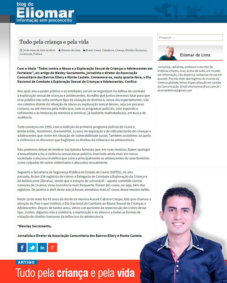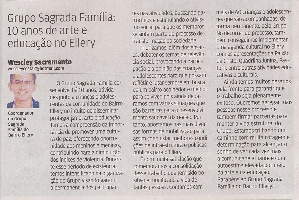 Jornalista, Educador Social, ex-presidente e atual diretor da Associação Comunitária dos Bairros Ellery e Monte Castelo e articulador de eventos culturais na região oeste de Fortaleza, Wescley Sacramento, foi Conselheiro Municipal de Juventude de Fortaleza e suplente do Conselho Estadual de Política Cultural do Ceará (2017), no segmento produtores culturais.Participações: