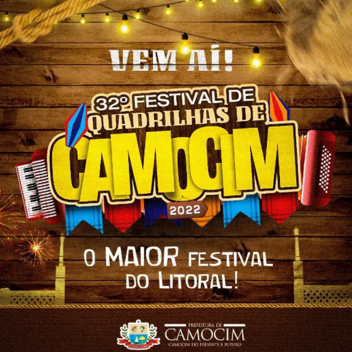A Prefeitura de Camocim-Ce, por meio da Secretaria da Cultura - SECULT, inscrita no CNPJ sob o nº 07.660.350/0001-23, torna pública a Inscrição para o XXXII FESTIVAL DE QUADRILHAS JUNINAS DE CAMOCIM, filiado à Federação das Quadrilhas Juninas do Ceará – FEQUAJUCE, que será realizado nos dias 30 e 31 de julho de 2022, na cidade de Camocim/CE.