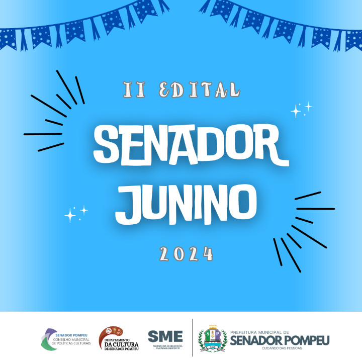 A Secretaria de Educação, Cultura e Desporto de Senador Pompeu, com fundamento na Lei Municipal Nº 1.585/2020, de 07 de julho de 2020, que dispõe sobre a criação do Fundo Municipal da Cultura, com aprovação na 12ª Reunião do Conselho Municipal de Políticas Culturais de Senador Pompeu-CMPC, torna público o processo de inscrição e seleção pública que regulamenta o II Edital Senador Junino 2024.