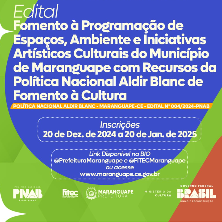 O presente Edital é uma das ações de execução da Política Nacional Aldir Blanc no Município de Maranguape/CE, sendo lançado para seleção de projetos que proponham a programação de espaços, ambientes e iniciativas artísticas e culturais do município de Maranguape/CE, com base na Lei Federal nº 14.399/22.