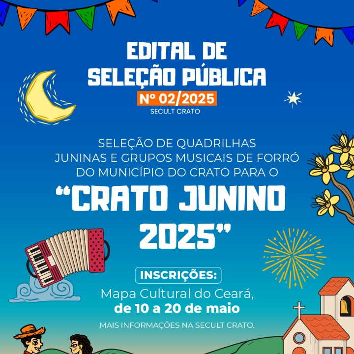 O presente edital tem por objeto a seleção de quadrilhas juninas (nas categorias A e B), São João Comunitário, Bandas de forró e Trios “pé de serra” para celebração de Termo de Execução Cultural visando compor a programação do “CRATO JUNINO 2025”, a ser realizado no período de 13 e 15 de junho de 2025, na cidade do Crato, no Cariri cearense.