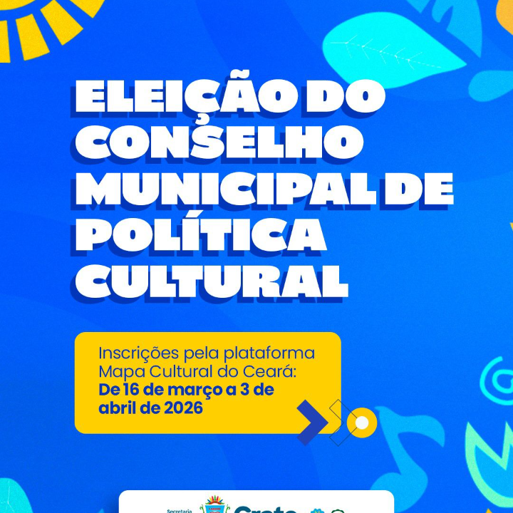 Edital de convocação para o processo eleitoral que escolherá os representantes da sociedade civil no Conselho Municipal de Política Cultural do Crato (CMPC). Serão eleitos 14 titulares e 14 suplentes de diferentes segmentos culturais do município, com mandato de dois anos, permitida uma recondução. As inscrições ocorrerão de 16 de março a 03 de abril de 2026 pela plataforma Mapa Cultural do Ceará, e a eleição será realizada no dia 07 de abril de 2026, no Centro Cultural do Araripe.