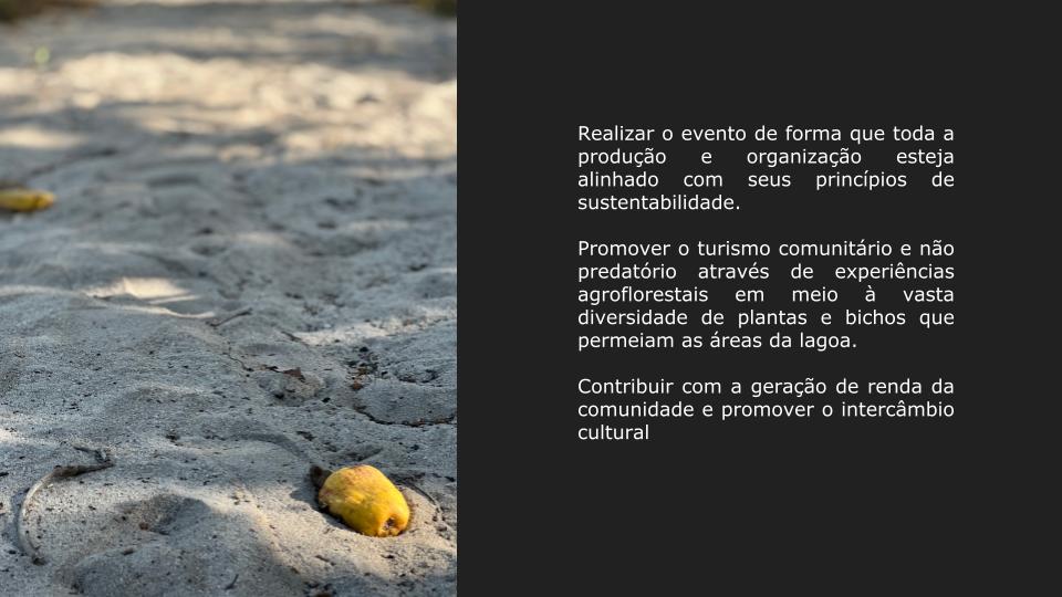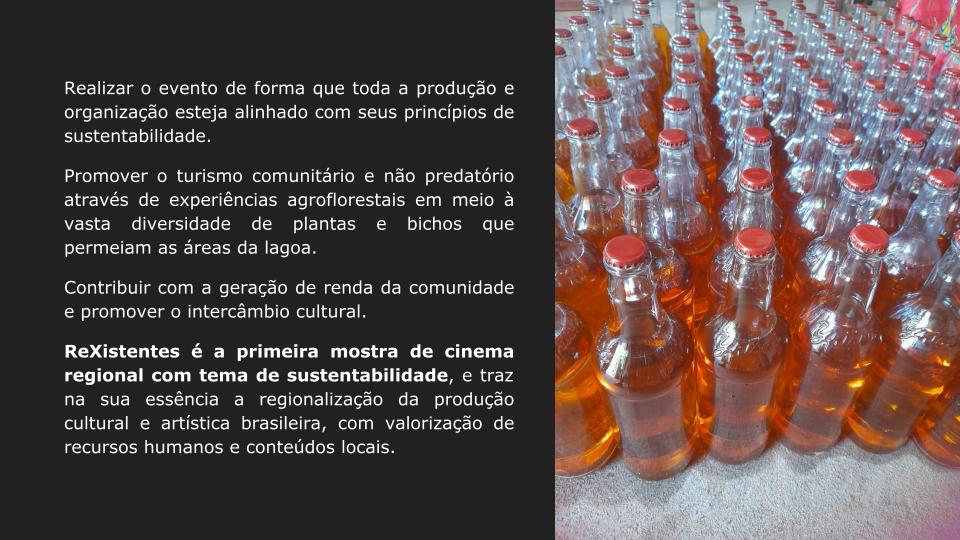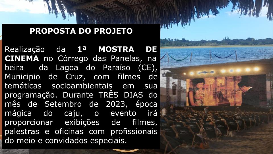 Realização da 1ª MOSTRA DE CINEMA nos arredores da Lagoa do Paraíso (CE), com filmes de temáticas socioambientais em sua programação. Durante TRÊS DIAS do mês de Setembro de 2023, época mágica do caju, o evento irá proporcionar exibições de filmes, palestras e oficinas com profissionais do meio e convidados especiais. Dentro da Mostra REXISTENTES, também acontecerão sessões voltadas para o público infanto-juvenil, seguidos de atividades artístico-pedagógicas e ambientais relacionadas com os filmes exibidos. Além de uma apresentação musical para encerrar a última noite.Galeria
