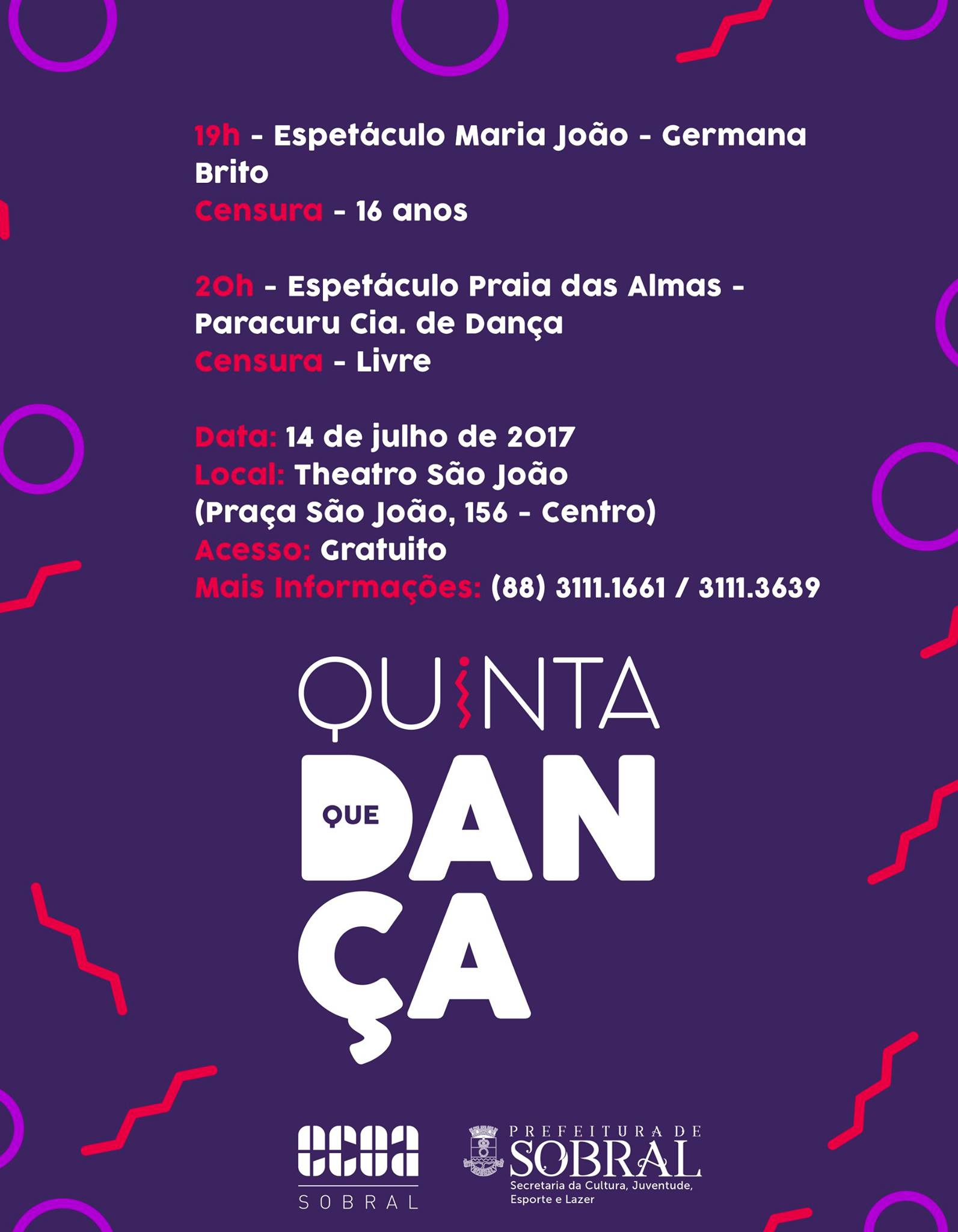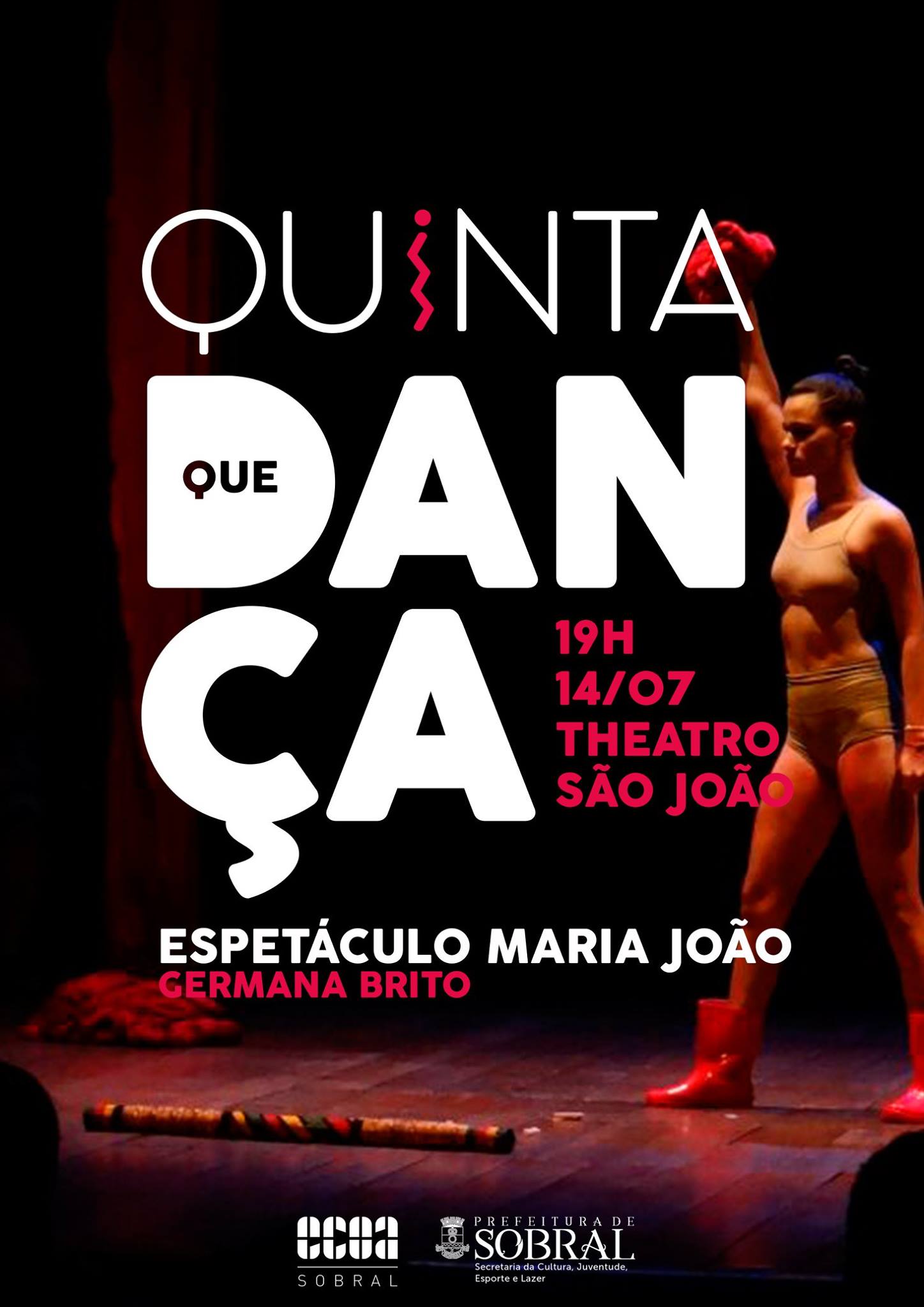 #QuintaQueDança | A Secretaria da Cultura, Juventude, Esporte e Lazer de Sobral (Secjel), através do Instituto Escola de Cultura, Comunicação, Ofícios e Artes - (ECOA) convidam os amantes da dança para assistirem aos espetáculos imperdíveis no Theatro São João!A mostra de trabalhos é comportar por obras e artistas do interior do Ceará.